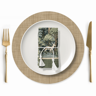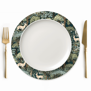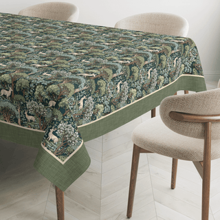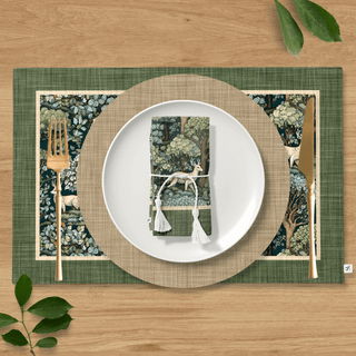 Lleva la magia del bosque invernal a tu mesa. Nuestra Panera Winter Woodland muestra delicados ciervos entre árboles y hojas en tonos verdes y crema, evocando calma y naturaleza. Totalmente reversible y confeccionada a mano en Guatemala con tela de apariencia tipo lino e impermeable. Ideal para pan, frutas o flores.