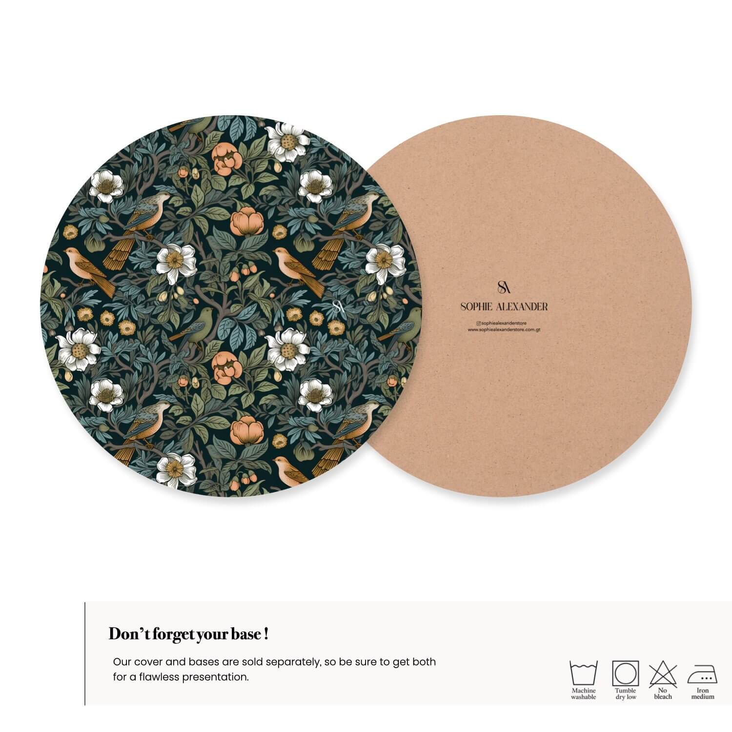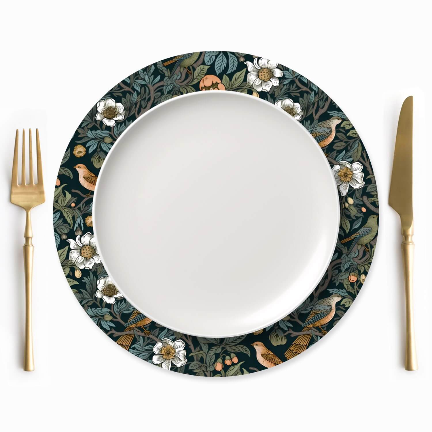 Step into a storybook scene with our Enchanted Garden Collection. Featuring hand illustrated birds, blooming florals, and leafy branches over a deep forest backdrop, this design brings depth, elegance, and a touch of wonder to your table. The rich palette of earthy greens, warm corals, and soft creams makes it perfect for cozy gatherings and timeless celebration.