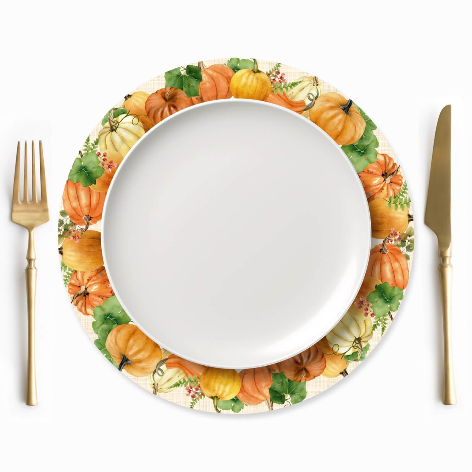 Celebrate the beauty of autumn with our Pumpkin Harvest Charger Plate Cover. A wreath of watercolor pumpkins, lush green leaves, and berry sprigs frames the center with seasonal warmth. Perfect for Thanksgiving or cozy fall gatherings, this design adds a festive, nature-inspired touch to your table.
