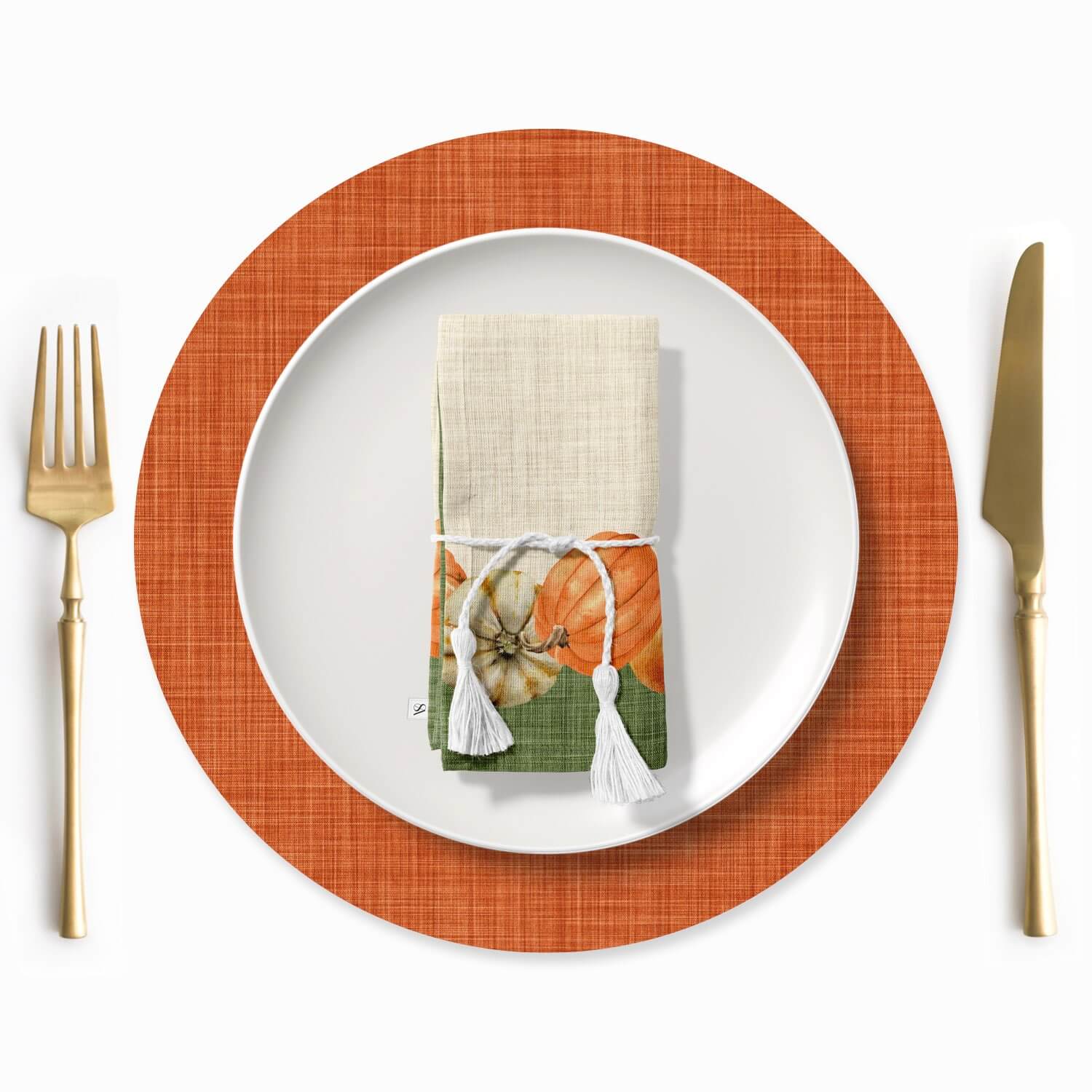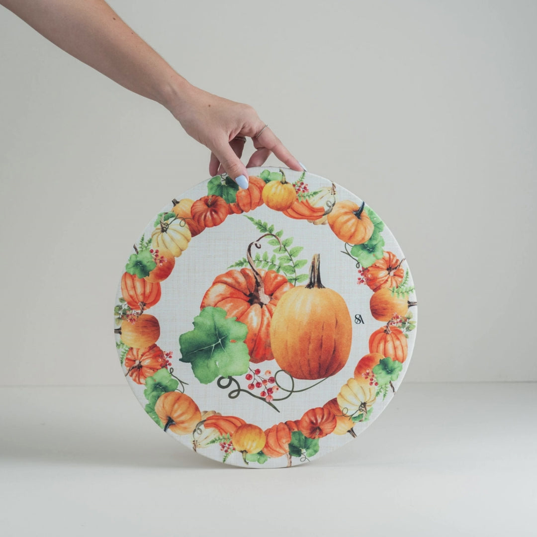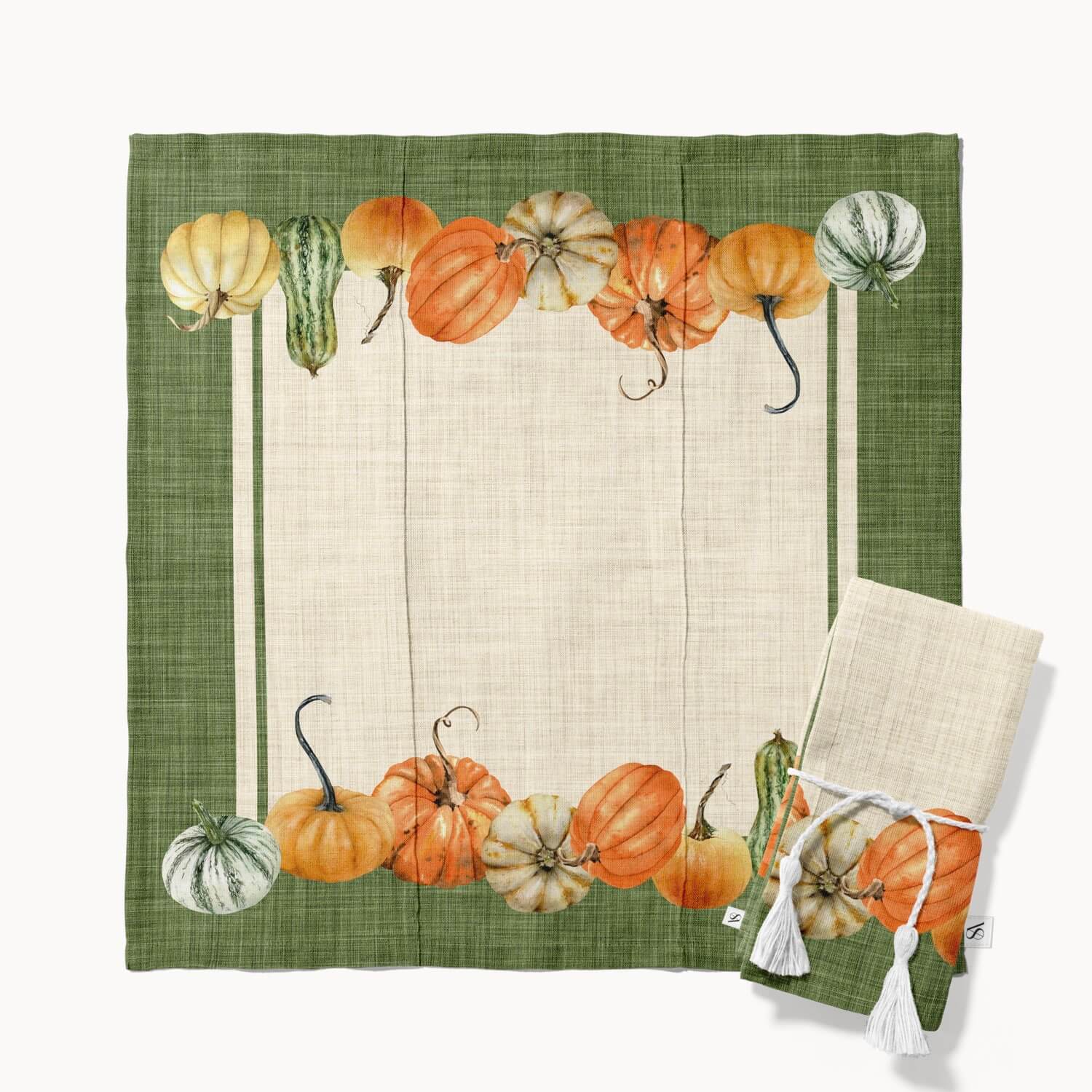 Celebrate the richness of autumn with our Pumpkin Medley Napkin. Hand painted pumpkins in shades of orange, cream, and green bring seasonal charm to each corner, framed by a deep green border that adds a grounding, elegant touch. Perfect for Thanksgiving feasts, cozy dinners, or everyday fall gatherings, this design captures the warmth and abundance of harvest time.