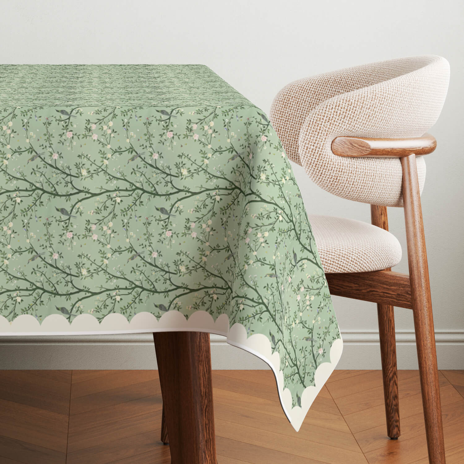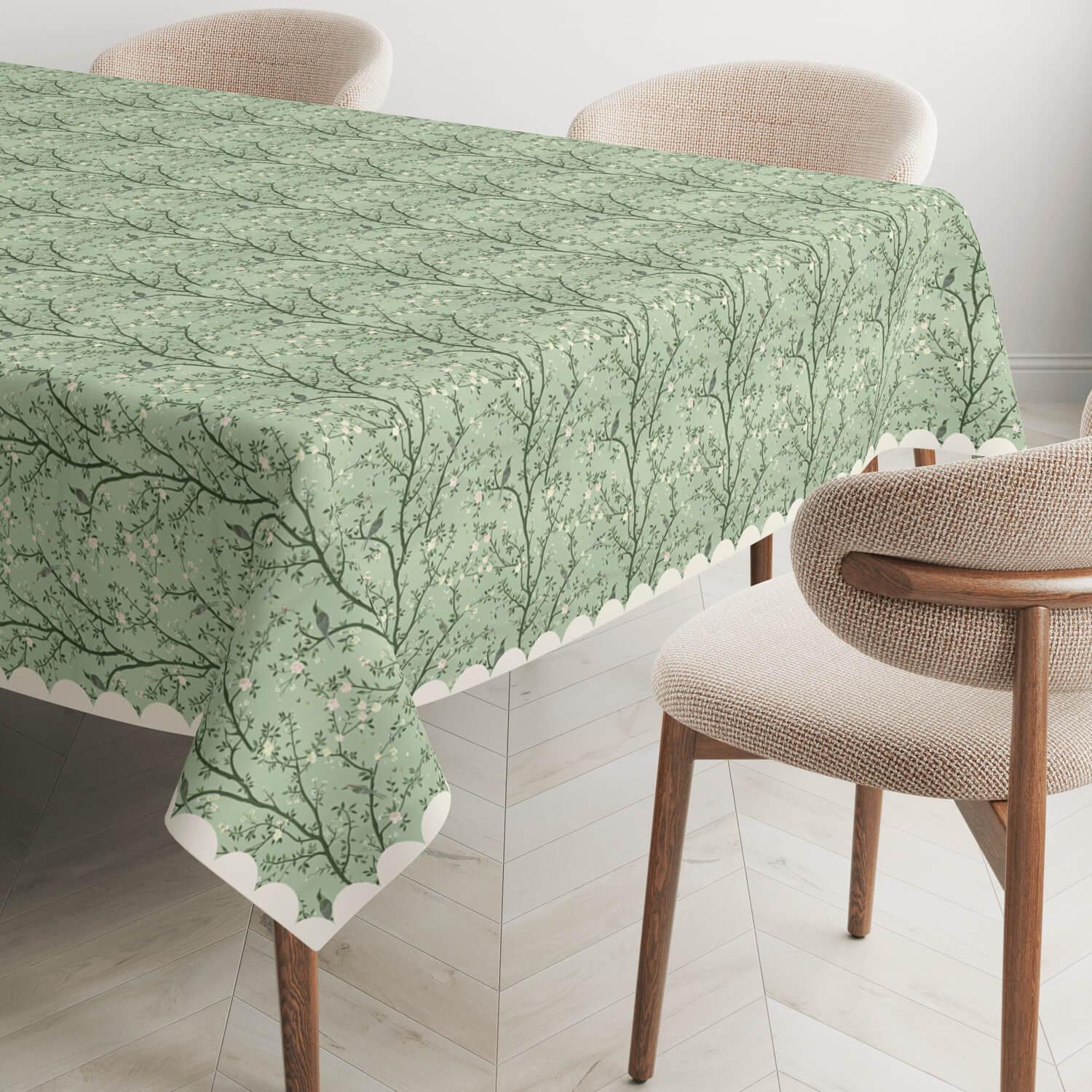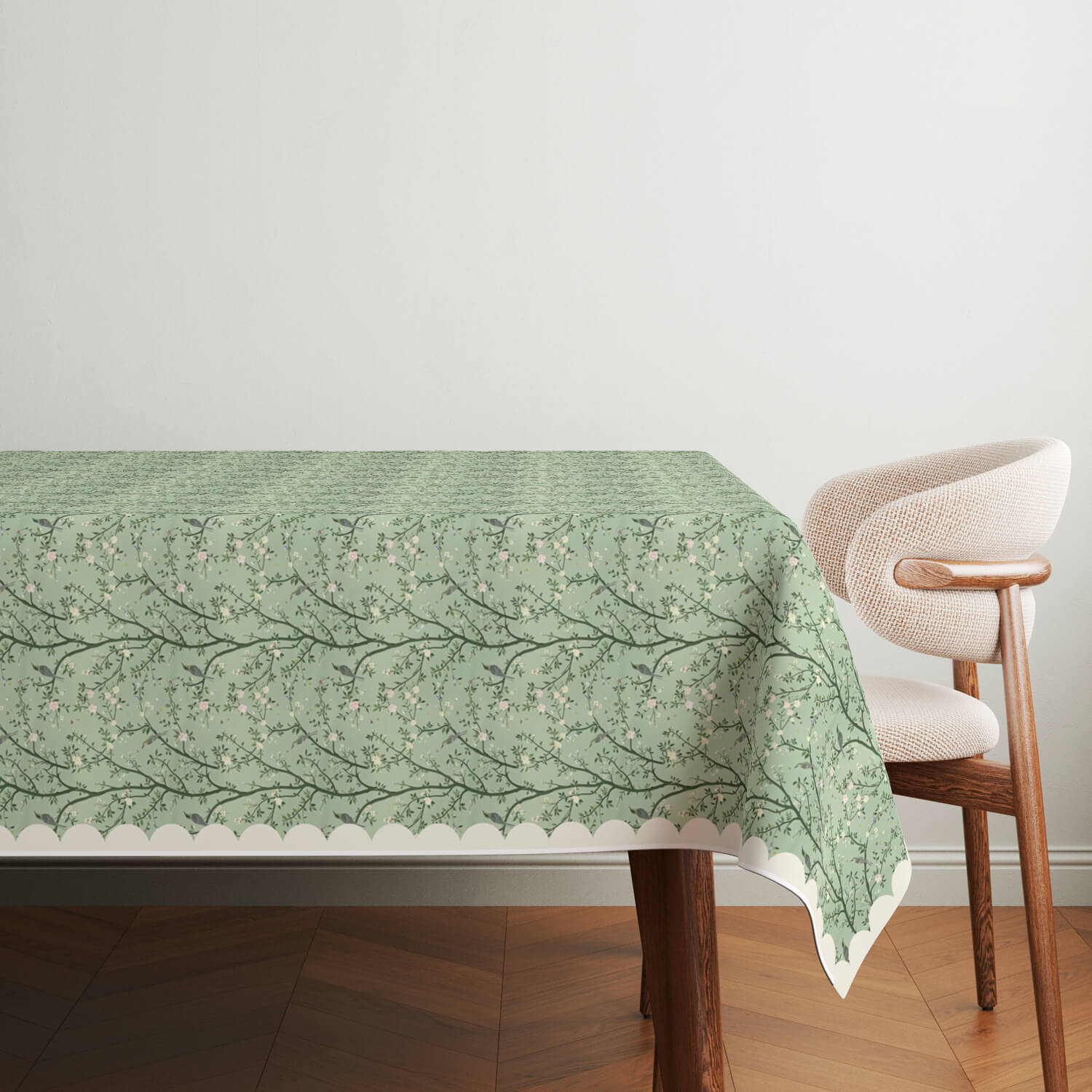Nature’s calm in every detail. Our Blooming Branch Tablecloth features hand drawn branches with tiny pale blossoms over a serene mint green backdrop. A scalloped ivory edge frames the soft, organic design with a classic touch perfect for cozy dinners, spring gatherings, or slow mornings that call for a gentle, graceful table.