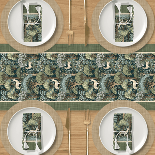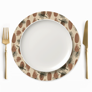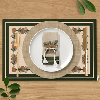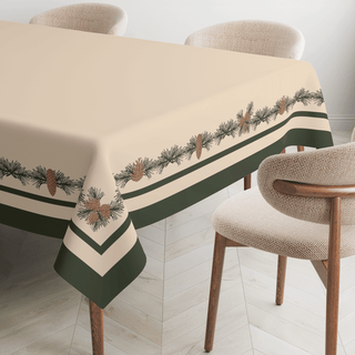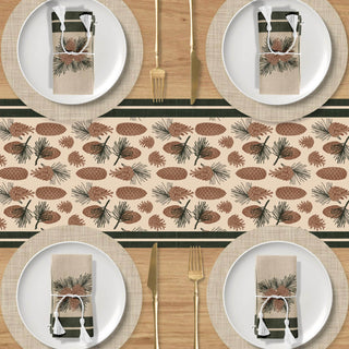 Lleva el bosque a tu mesa con nuestro Camino de Mesa Pinewood Charm. Adornado con piñas, hojas de roble y ramitas de pino sobre un fondo beige cálido, enmarcado en verde profundo. Un acento rústico pero elegante, perfecto para reuniones acogedoras y mesas festivas.