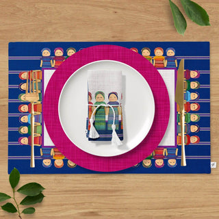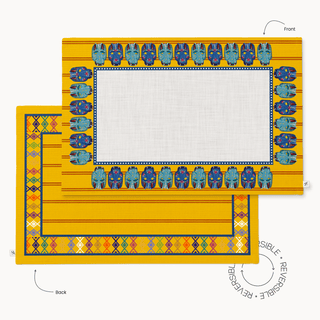 Infuse your table with sunshine and tradition. Our Worry Doll Gold Sienna Linen Reversible Placemat celebrates the colorful charm of Guatemala’s worry dolls each full of character and heart. One side shows rows of dolls on a golden sienna backdrop with cross stitch borders, while the reverse offers vertical orange stripes for a modern twist.