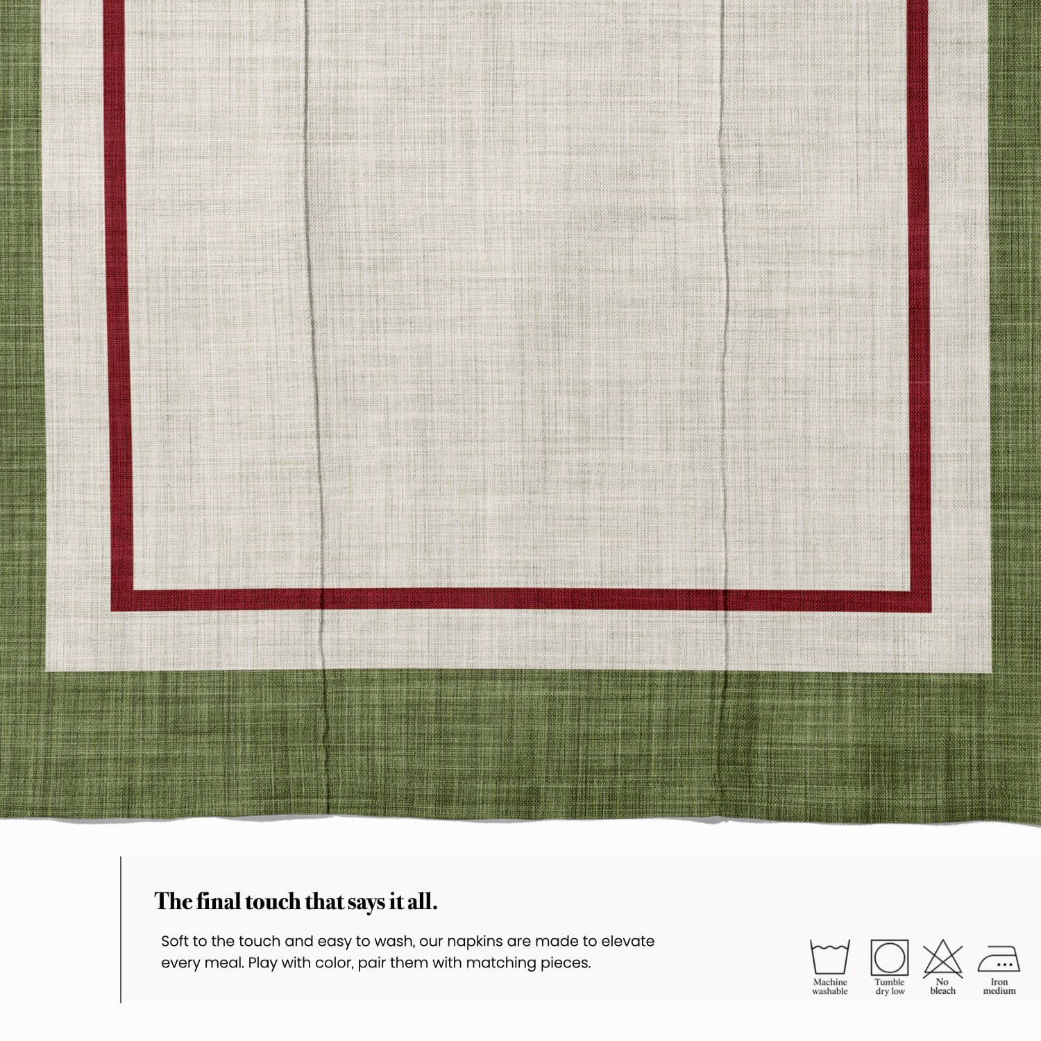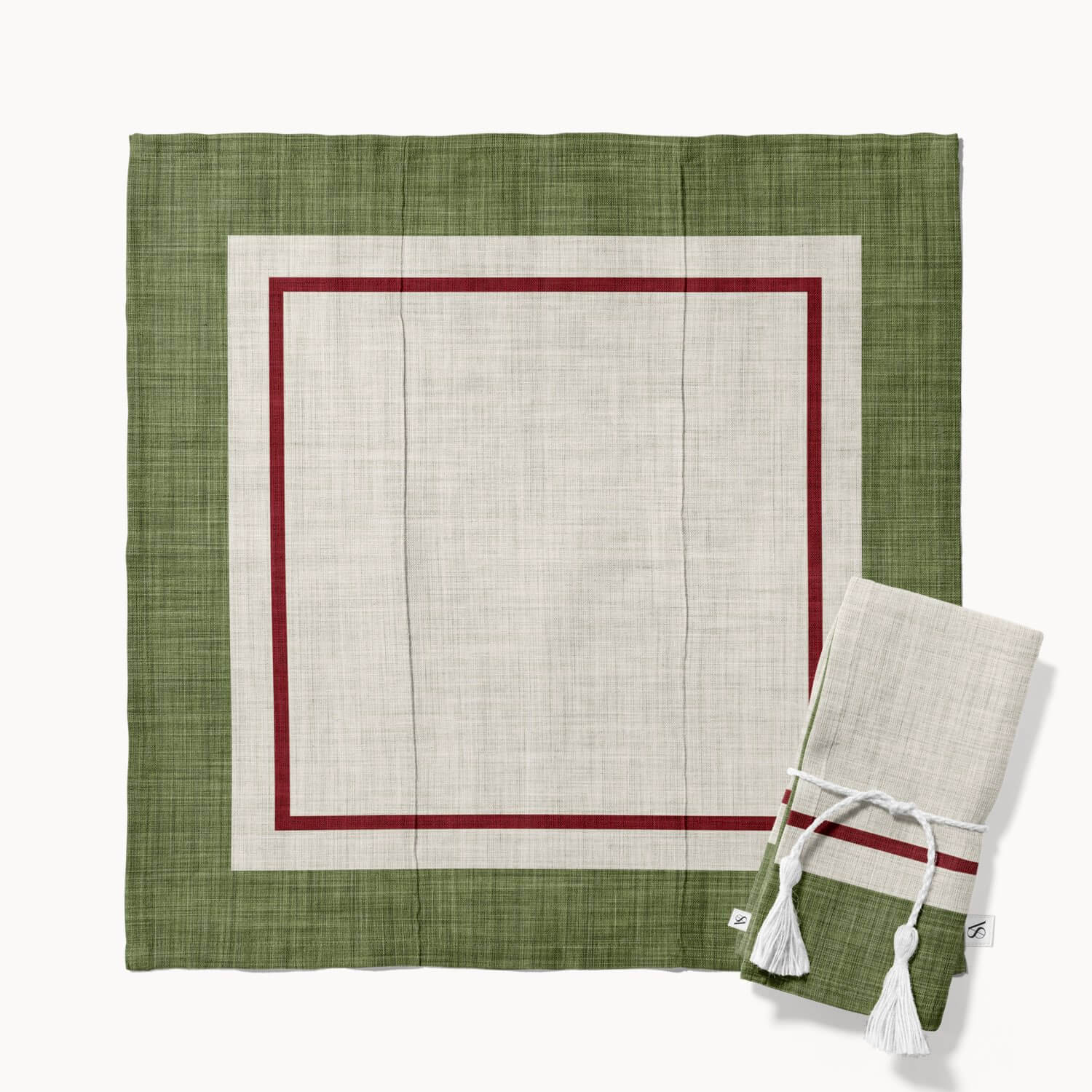 Un diseño atemporal que une la serenidad del verde musgo con la energía del rojo. Su equilibrio de colores y textura tipo lino crea un estilo clásico y acogedor, ideal para cenas familiares o celebraciones de temporada.
