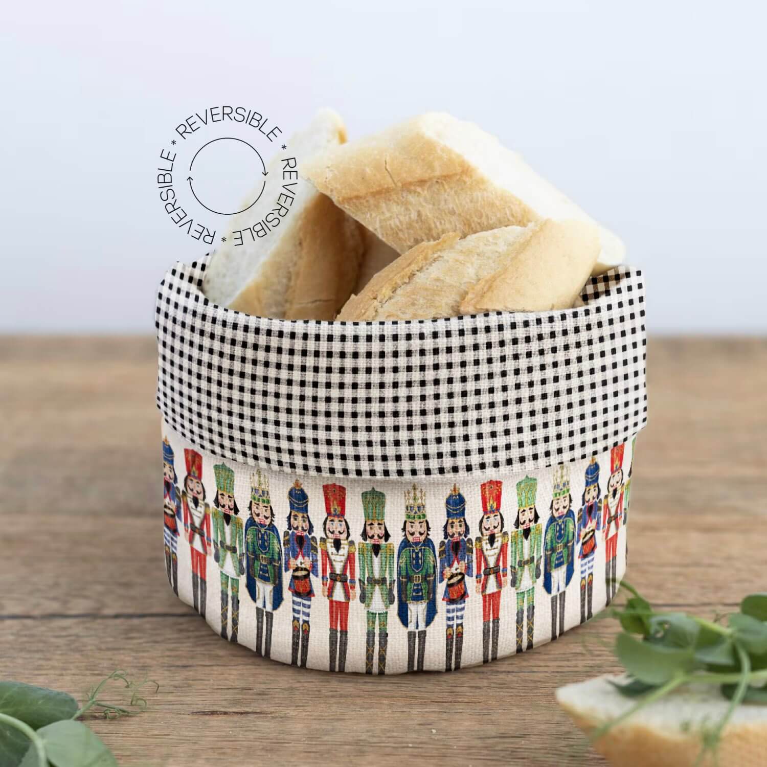 • Llena tu mesa de alegría navideña con nuestra panera reversible The Christmas March. Presenta una encantadora fila de cascanueces coloridos sobre fondo crema y, al voltearla, revela un diseño de cuadros negros y blancos clásico y versátil.