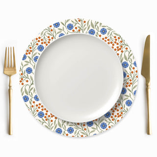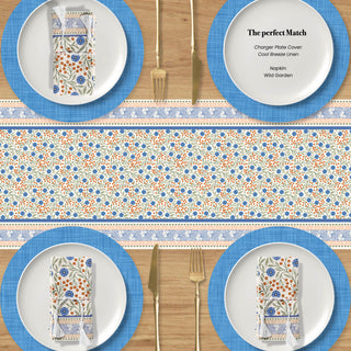 • Bring a burst of color and whimsy to your table with our Wild Garden Napkin. Hand illustrated blue florals and clusters of orange berries weave through flowing green vines. Framed by intricate blue and saffron borders, this design captures the lively spirit of a countryside garden in full bloom.