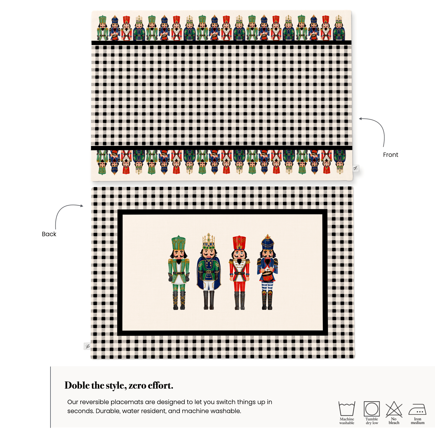 Doble estilo, cero esfuerzo. Nuestro Individual The Christmas March combina el encanto clásico de los cascanueces con cuadros negros y blancos para una mesa alegre y elegante. Hecho a mano en Guatemala con tela semi impermeable, es perfecto para celebrar la temporada con estilo y sin preocupaciones.