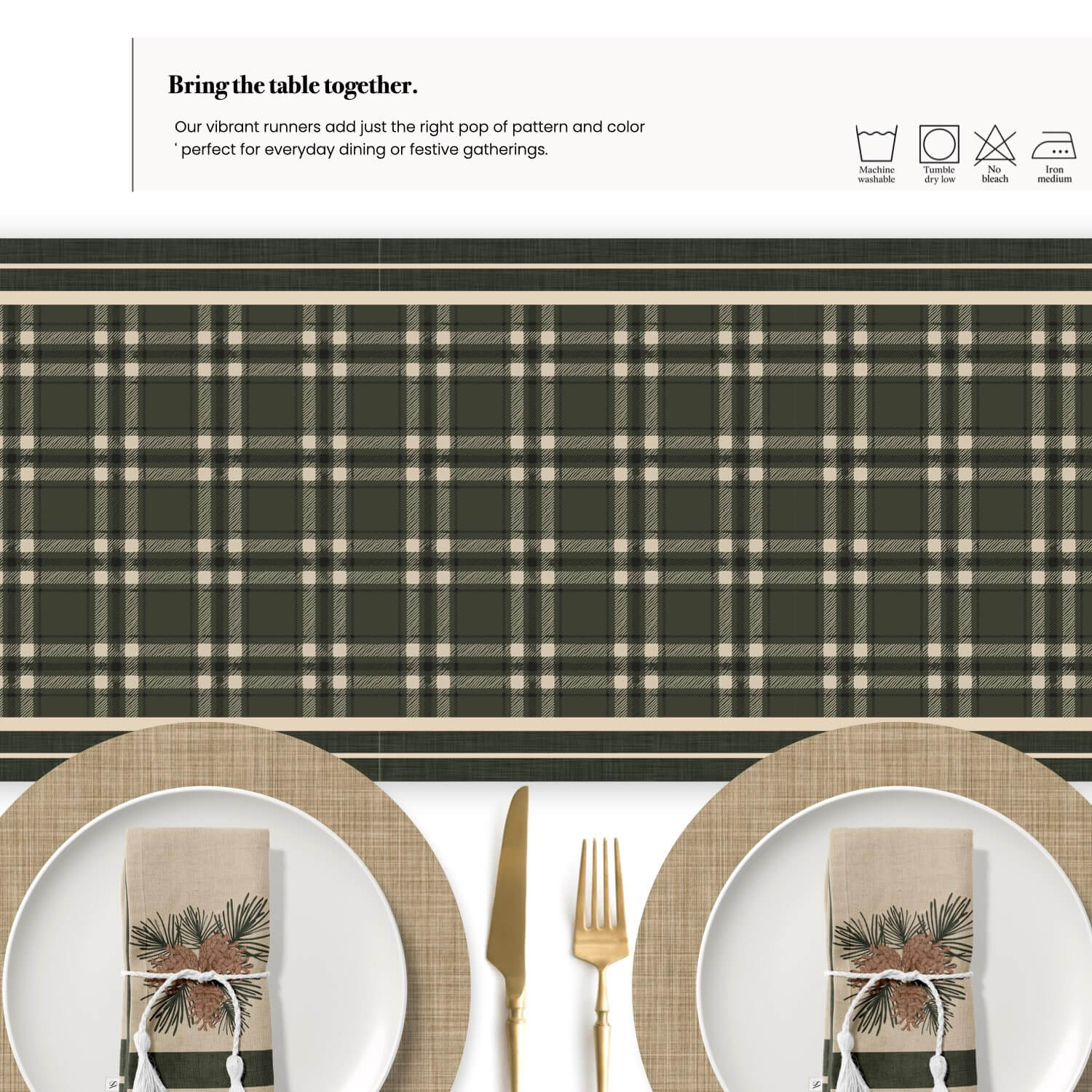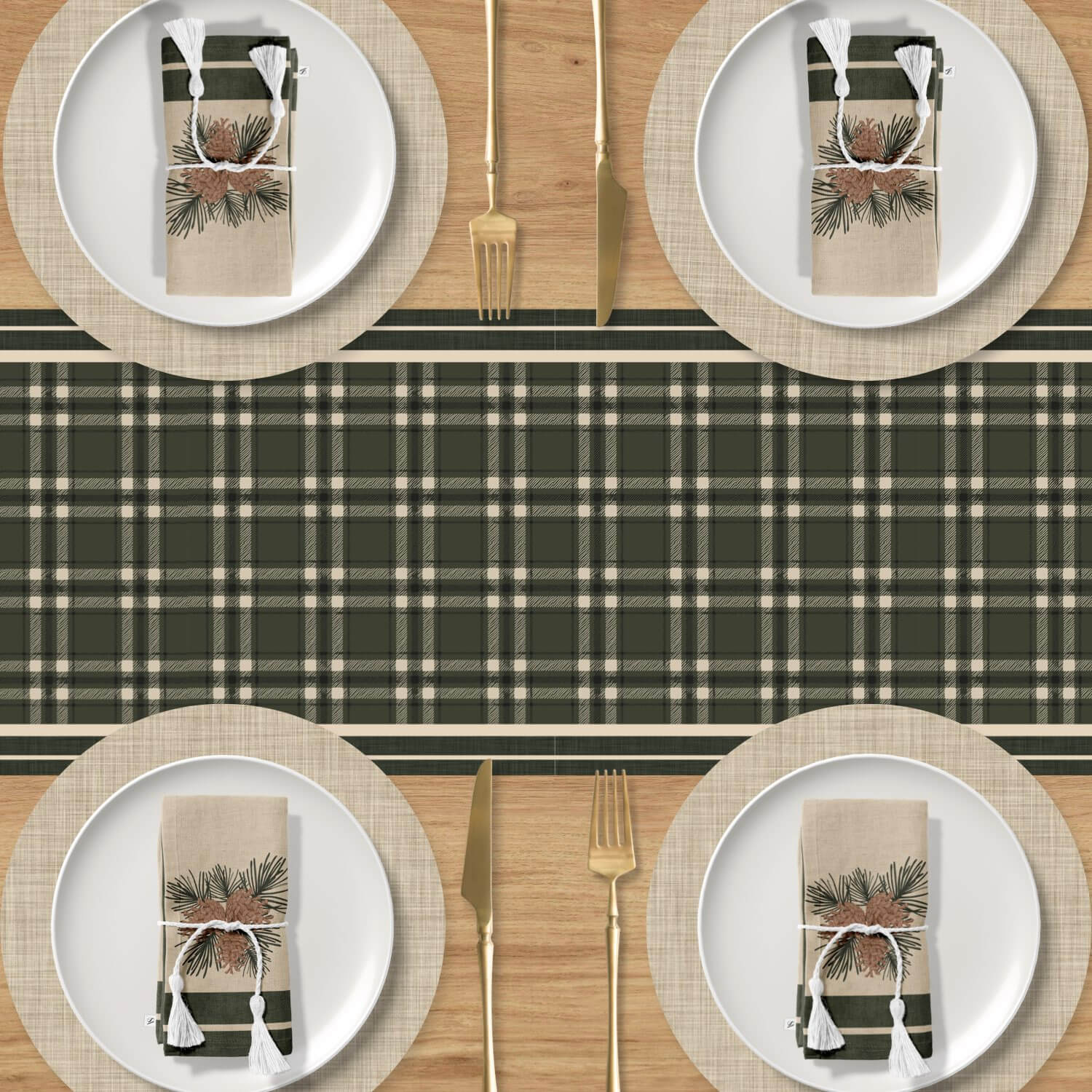 Lleva el bosque a tu mesa con nuestro Camino de Mesa Pinewood Charm. Adornado con piñas, hojas de roble y ramitas de pino sobre un fondo beige cálido, enmarcado en verde profundo. Un acento rústico pero elegante, perfecto para reuniones acogedoras y mesas festivas.
