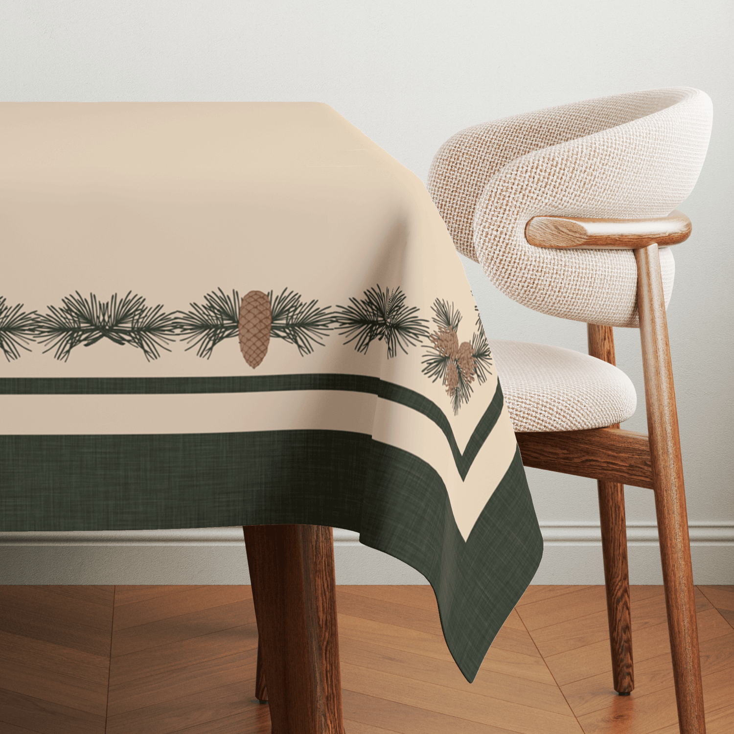 Decora tu mesa con la calidez natural del invierno. Con un diseño de guirnalda de piñas de pino y ramas verdes que recorre elegantemente los bordes, este mantel combina un estilo rústico y sofisticado. Perfecto para reuniones navideñas y momentos en familia, aporta un encanto acogedor y festivo a cada comida.