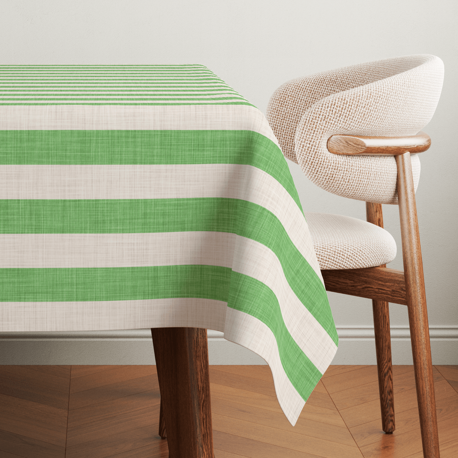 • A breath of fresh air for your everyday table. Our Spring Meadow Linen Stripes Tablecloth pairs clean ivory with cheerful green stripes that feel like a picnic in bloom. Bright and balanced, it’s perfect for welcoming the season or adding joy to any meal.