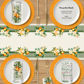 • Add zest and charm with our Arancia di Maiolica Table Runner. Hand painted oranges and delicate white blossoms rest on a crisp white backdrop, framed by bold blue maiolica style borders inspired by classic Mediterranean tiles. Lively and radiant, it blends tradition with sunshine for a table full of warmth and character.