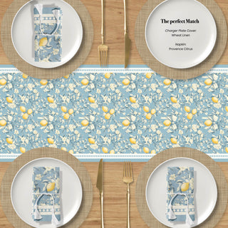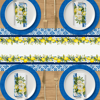 Add zest and charm with our Arancia di Maiolica Table Runner. Hand painted oranges and delicate white blossoms rest on a crisp white backdrop, framed by bold blue maiolica style borders inspired by classic Mediterranean tiles. Lively and radiant, it blends tradition with sunshine for a table full of warmth and character.