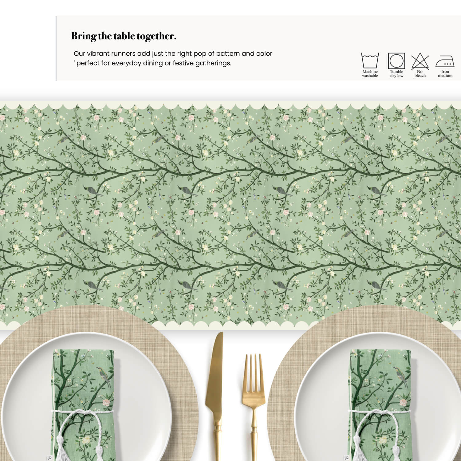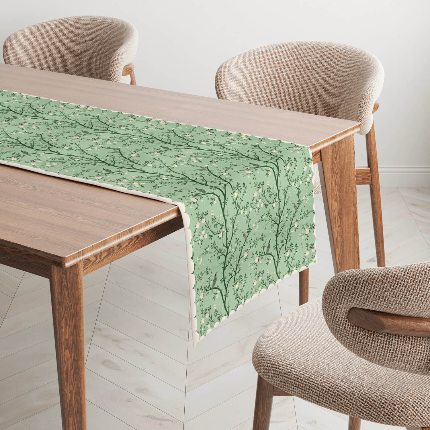 Brighten your meals with our Blooming Branch Table Runner. Graceful branches stretch across a soft green backdrop, dotted with tiny pink blossoms and delicate leaves that evoke the calm of early spring. A cream scalloped border frames the design with a gentle, storybook touch.