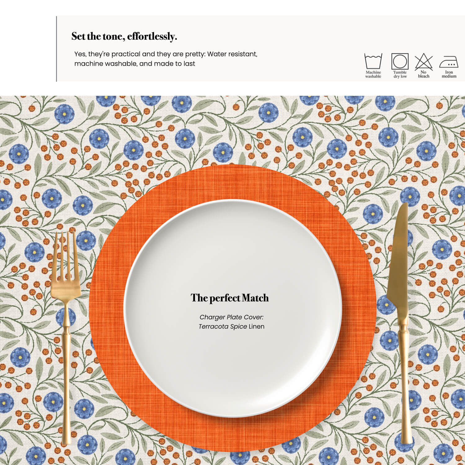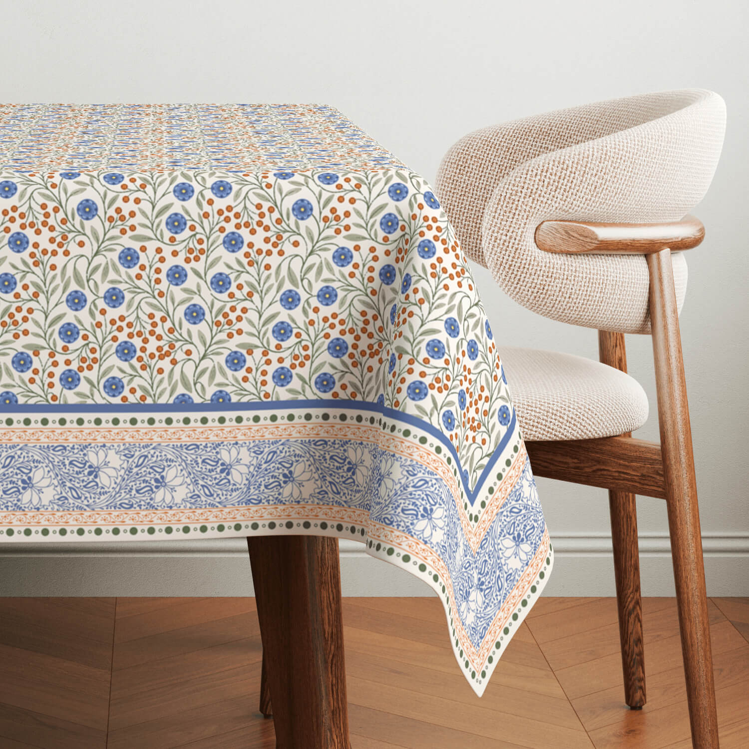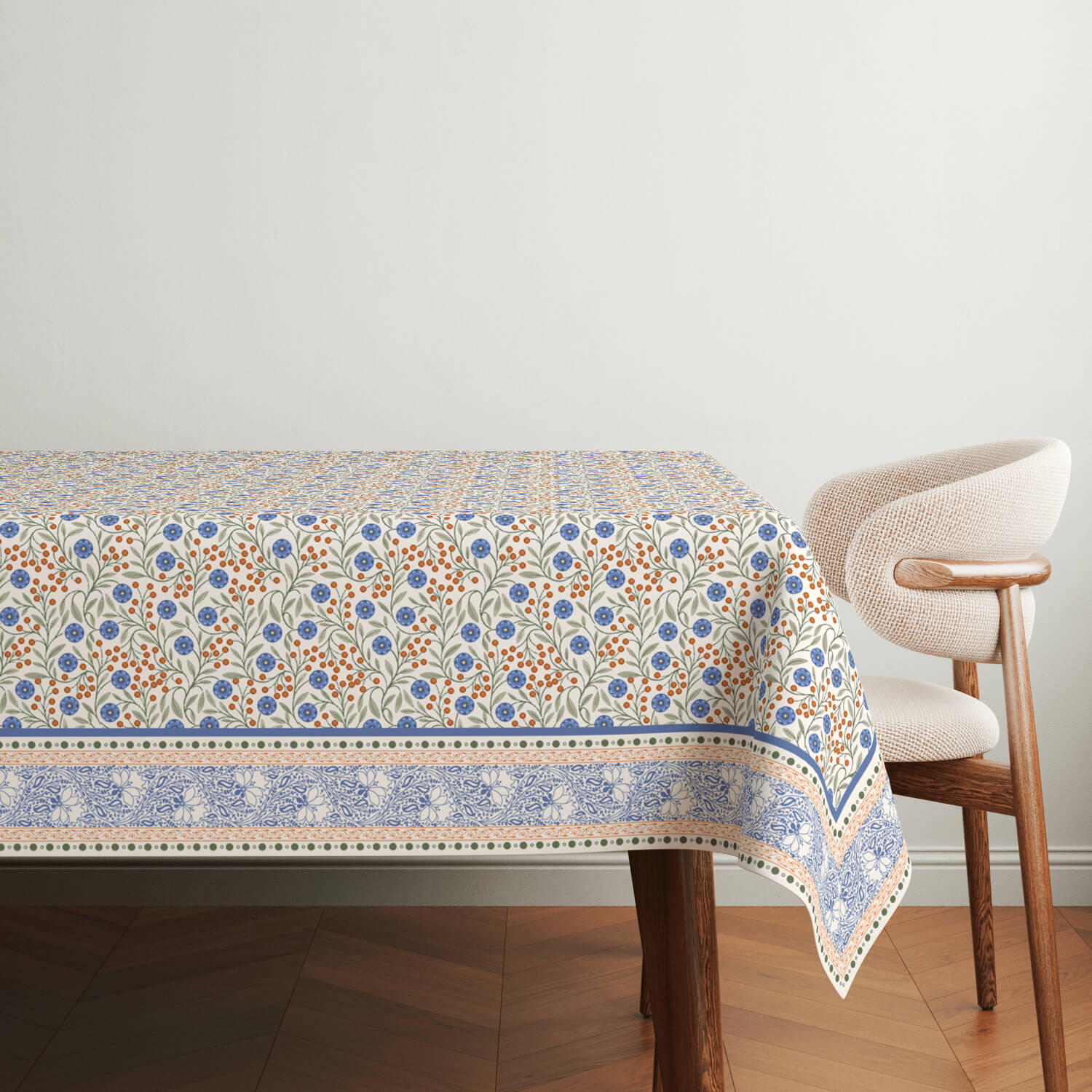 Our Wild Garden Tablecloth is an ode to timeless botanical prints, with delicate blue blossoms and orange berries framed by a vintage inspired border. Soft sage vines and dotted trim add nostalgic elegance, bringing the charm of a secret garden to your table.