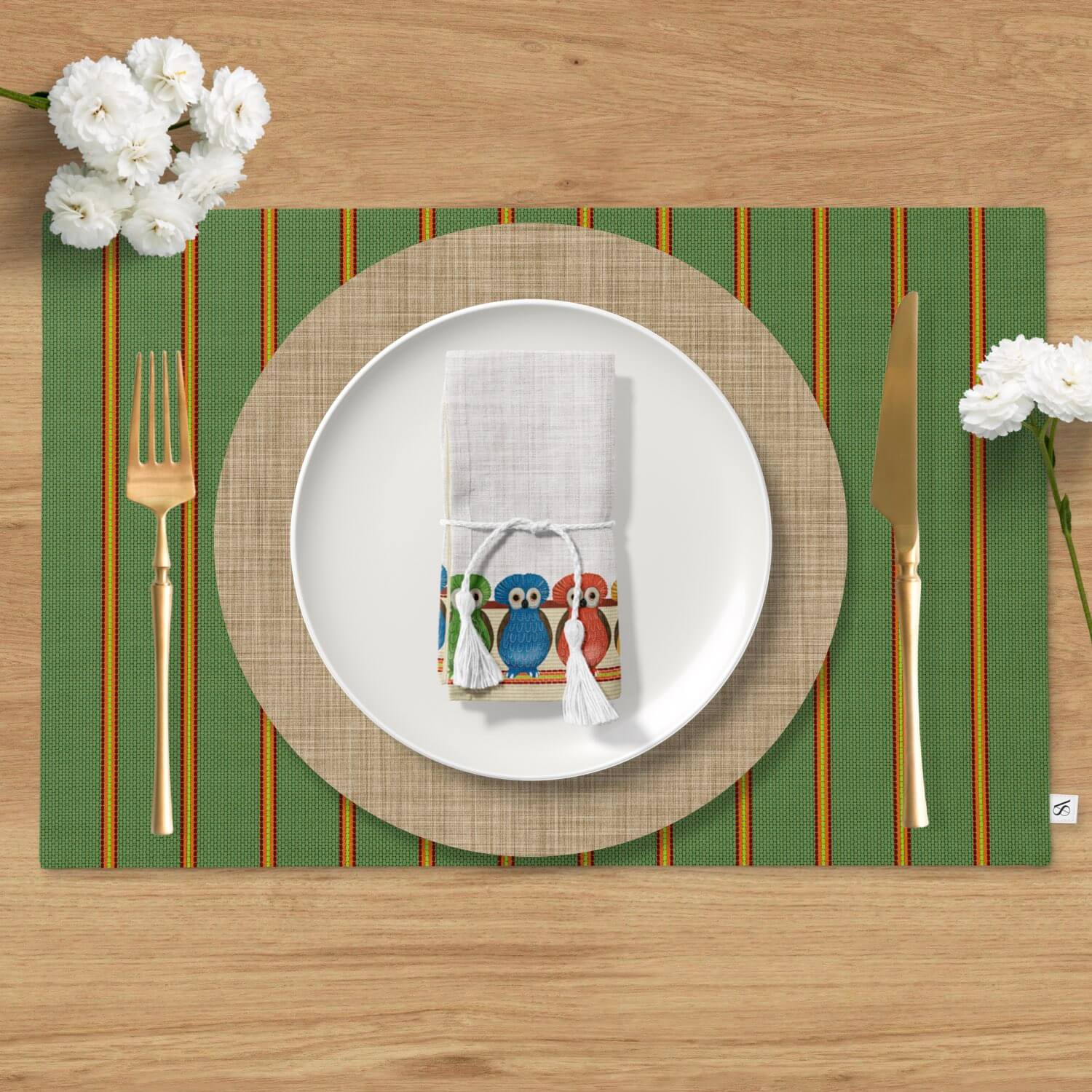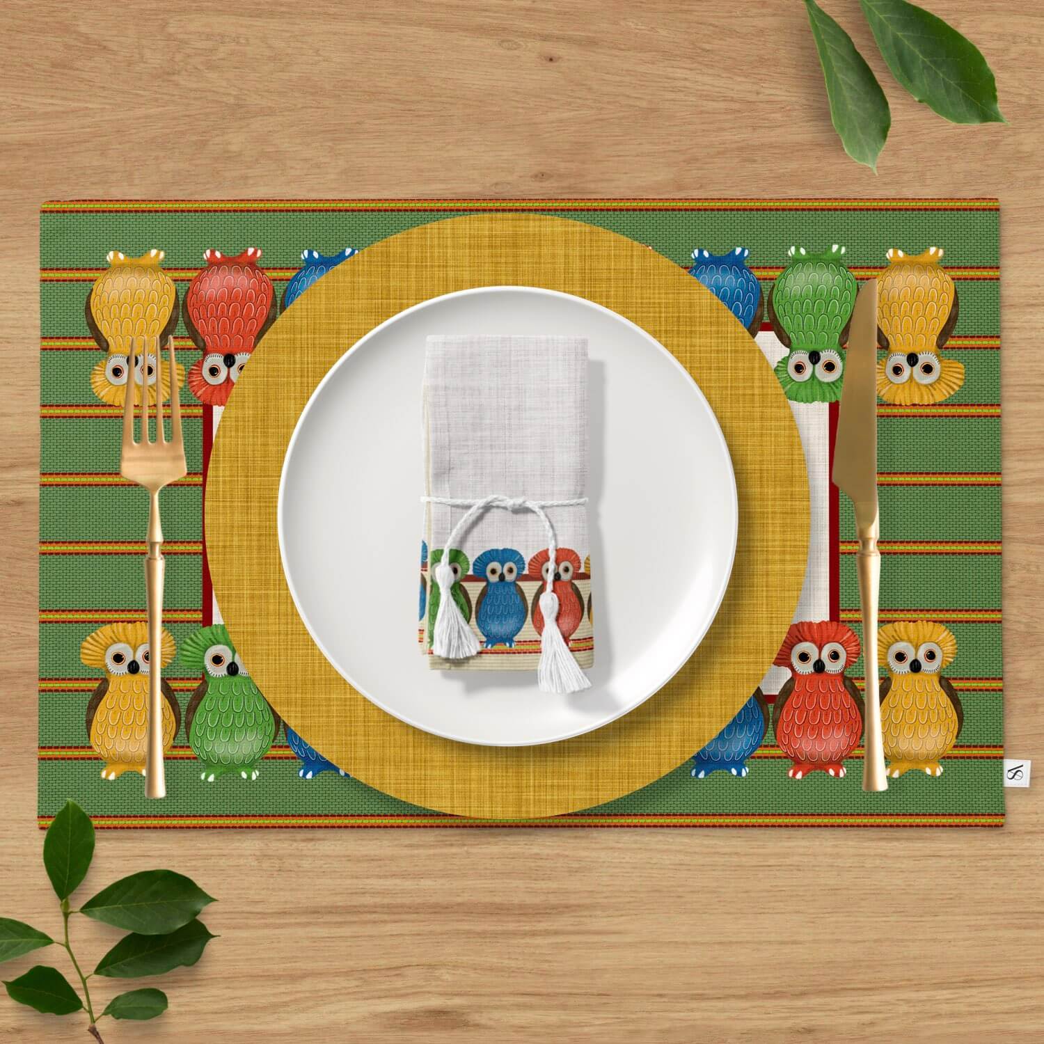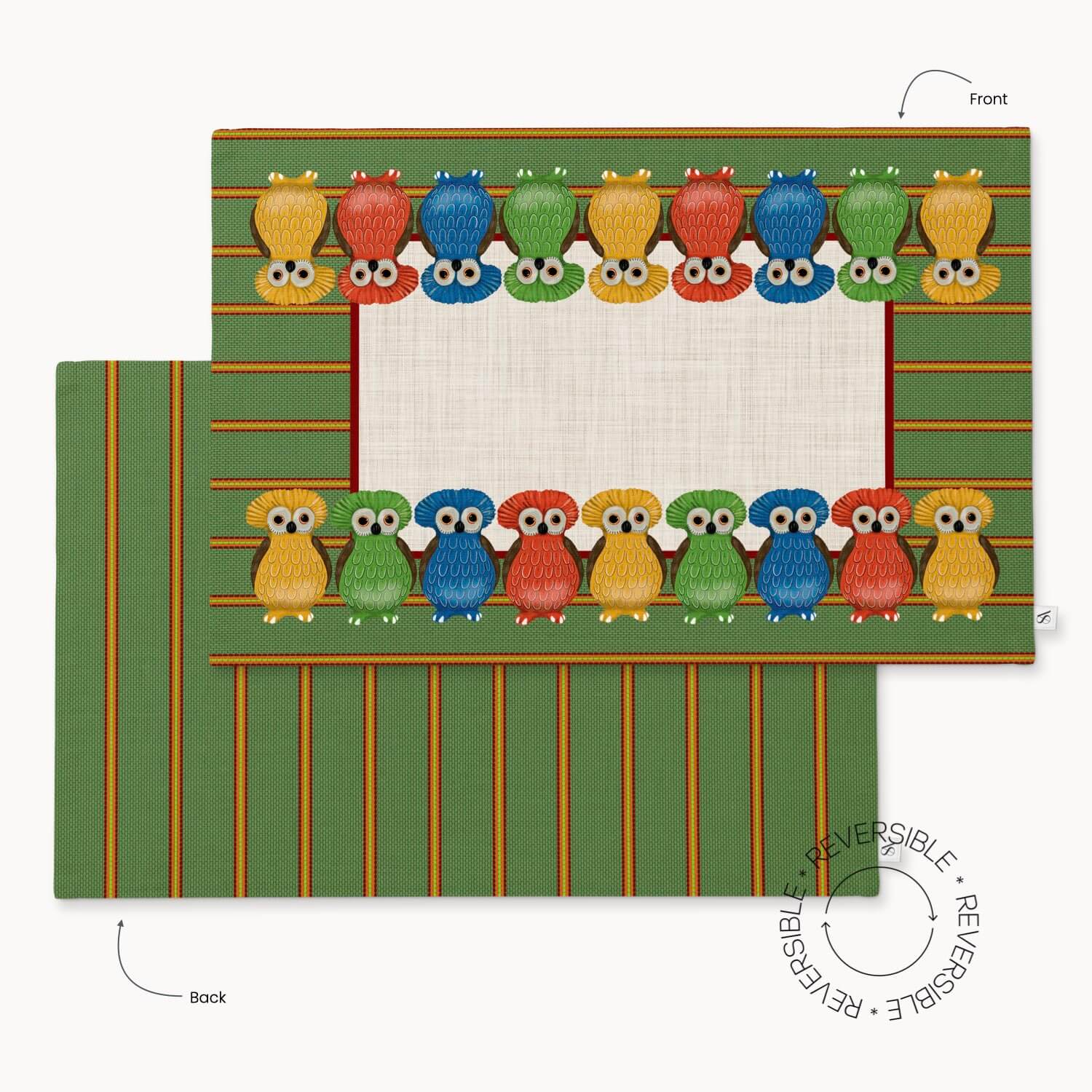 Celebrate heritage with a playful twist. Our Owl Moss Reversible Placemat features a vibrant double sided design inspired by Guatemalan huipiles. One side shows a detailed moss green striped motif, while the other bursts with personality rows of colorful owls on a textured background that mimics handwoven fabric.