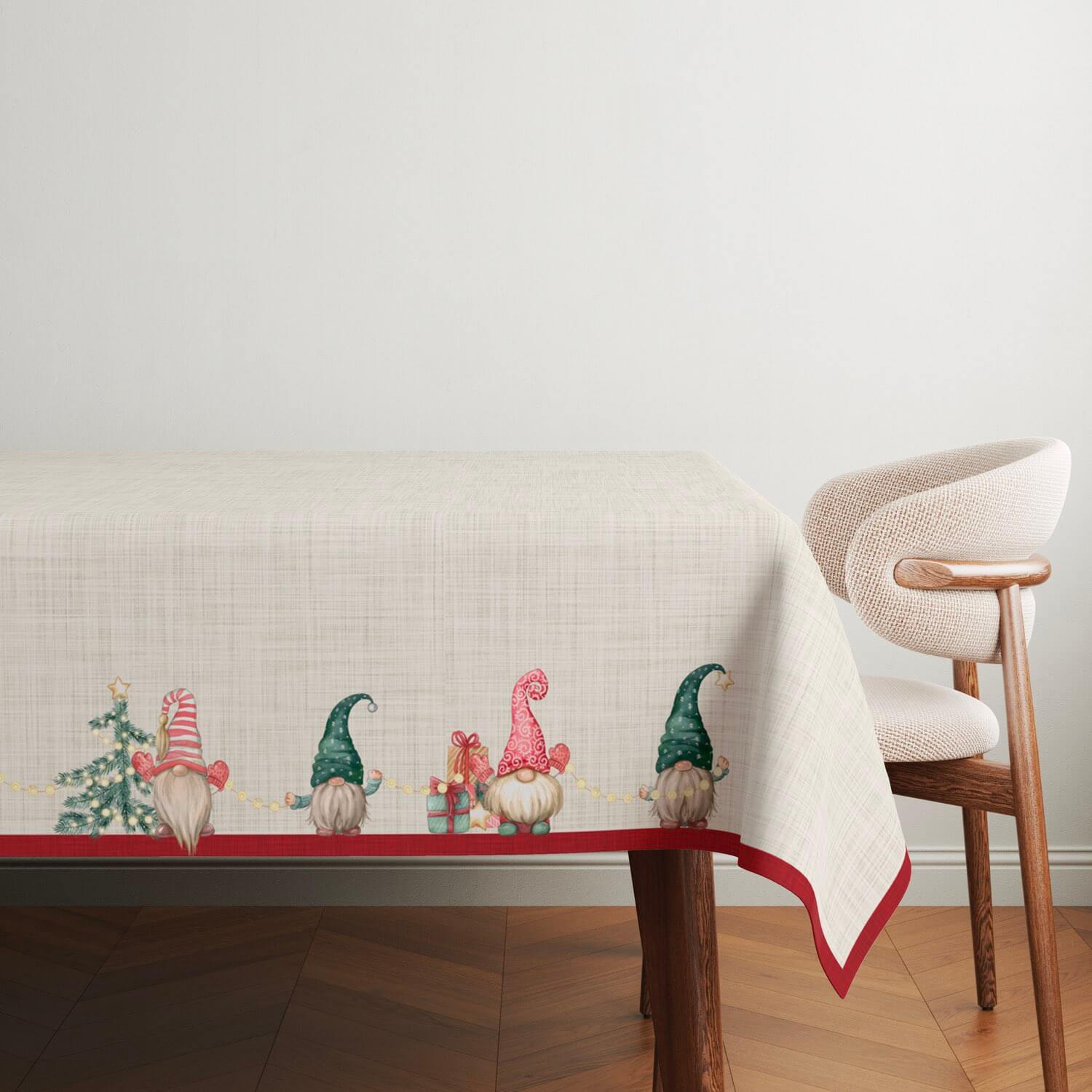 Lleno de encanto y alegría, este mantel presenta divertidos gnomos navideños con gorros en tonos rojos y verdes, rodeados de regalos y luces festivas. Su diseño juguetón y familiar convierte cualquier mesa en un escenario lleno de magia y espíritu navideño.