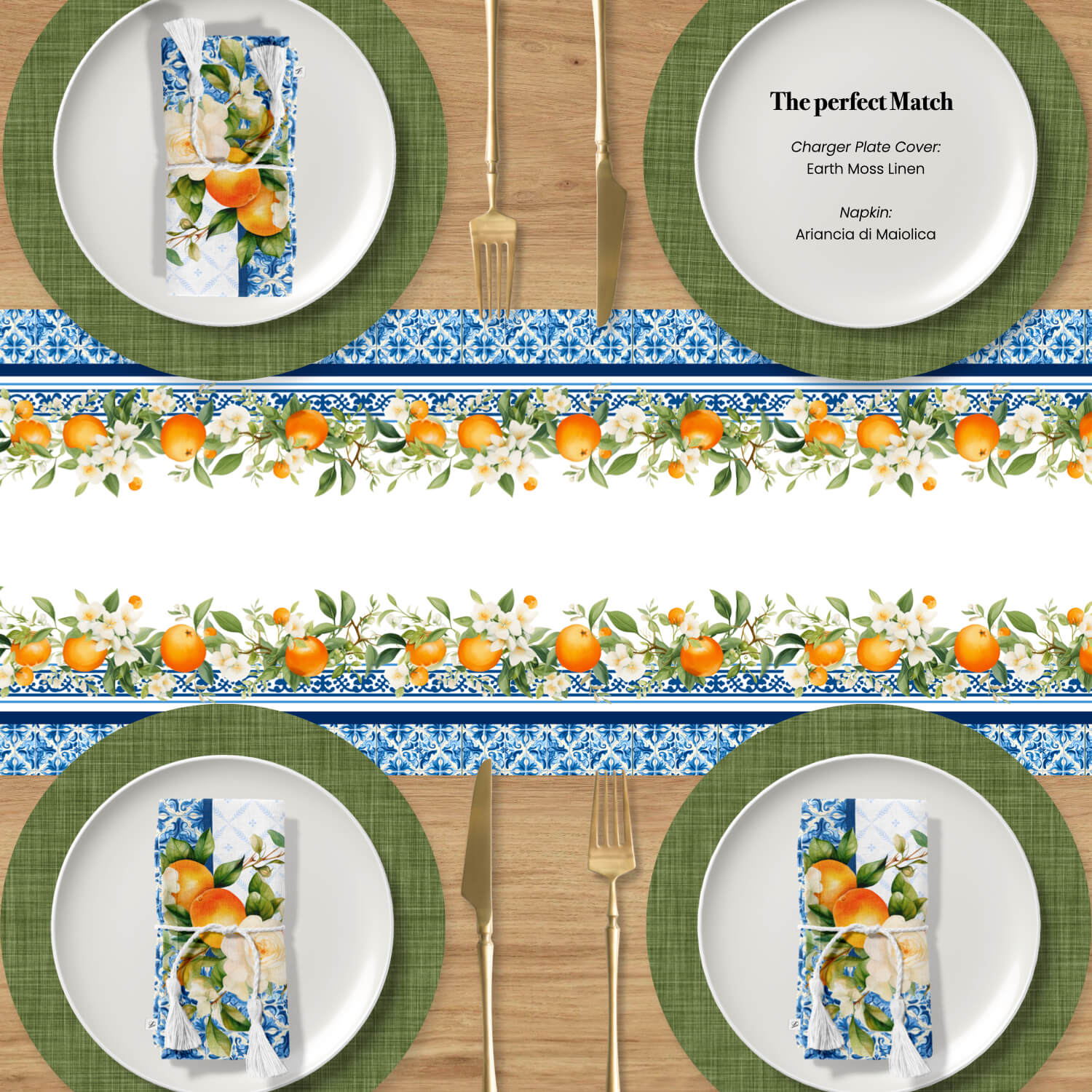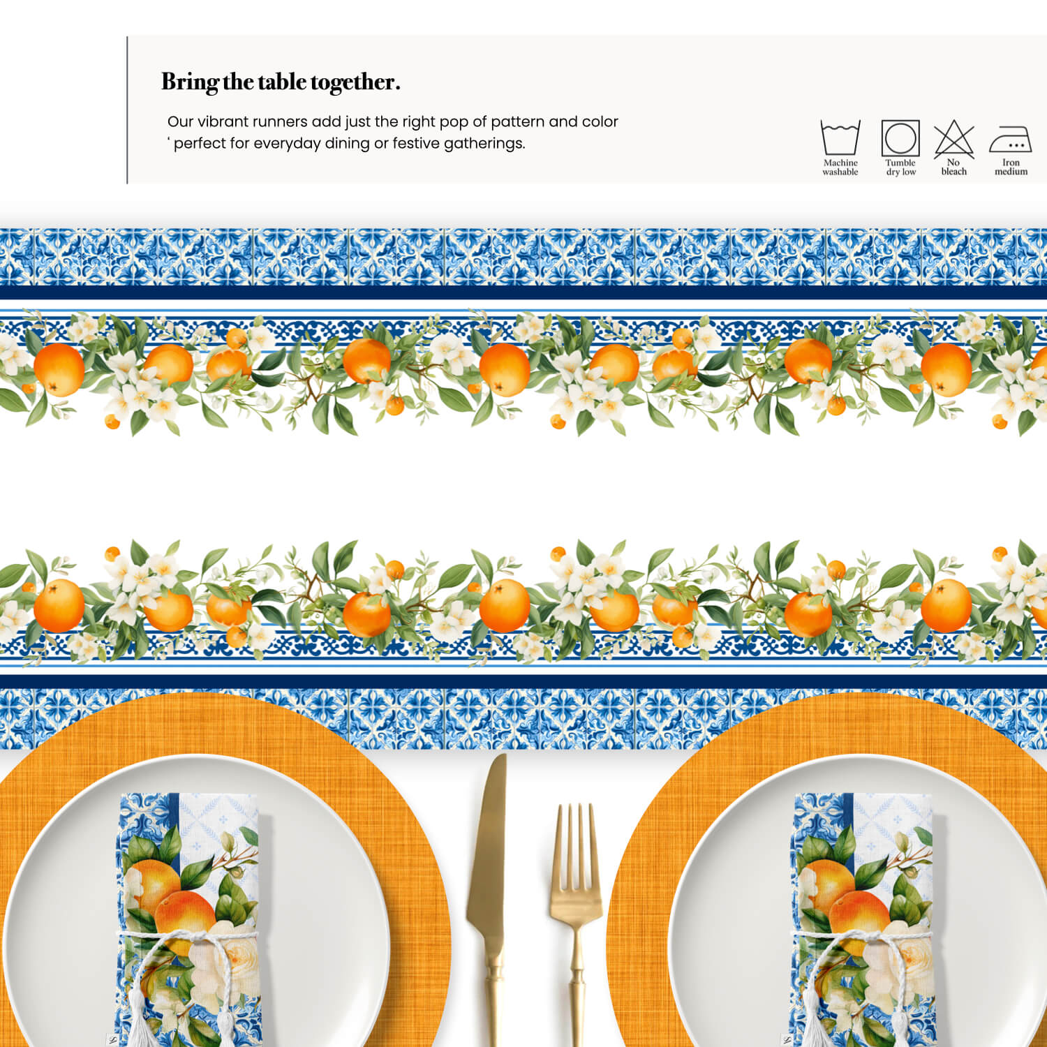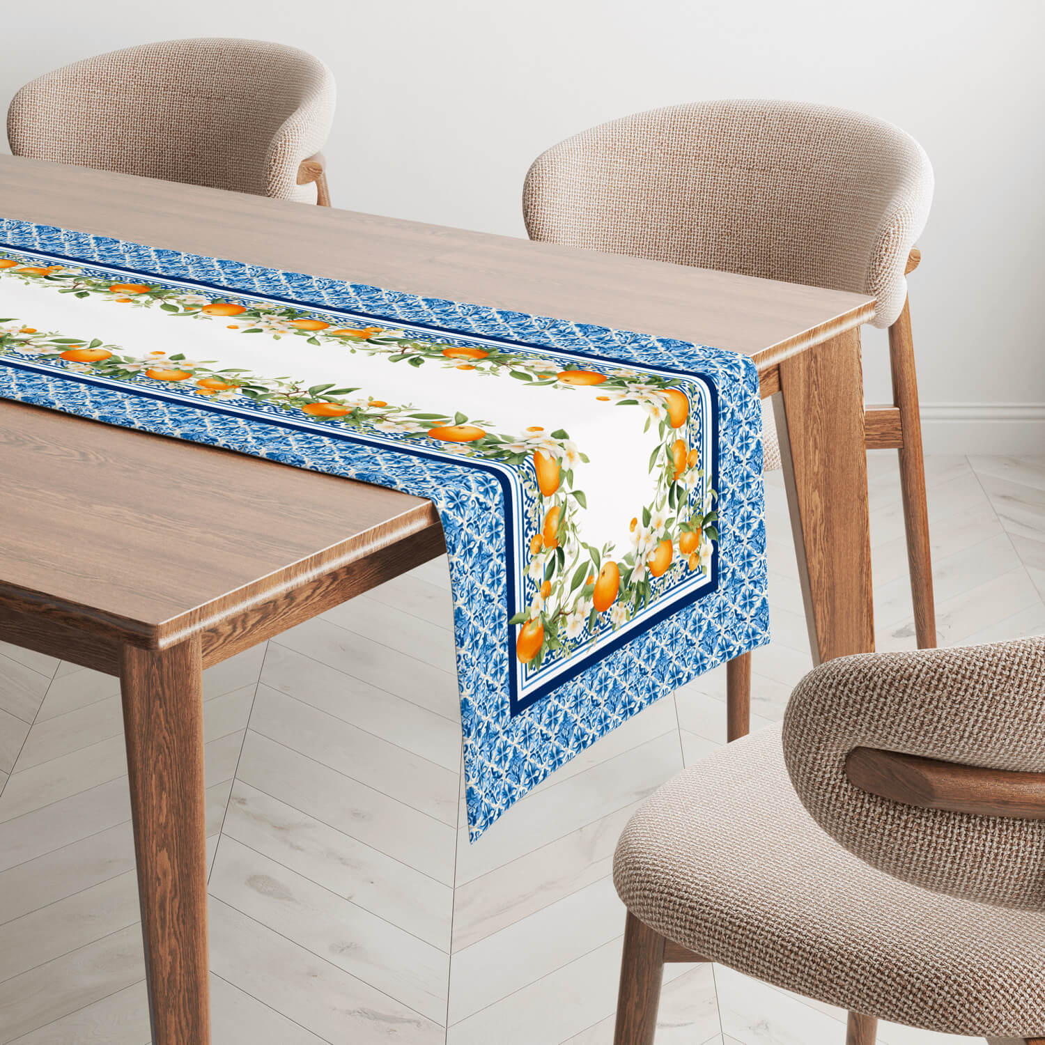 Add zest and charm with our Arancia di Maiolica Table Runner. Hand painted oranges and delicate white blossoms rest on a crisp white backdrop, framed by bold blue maiolica style borders inspired by classic Mediterranean tiles. Lively and radiant, it blends tradition with sunshine for a table full of warmth and character.