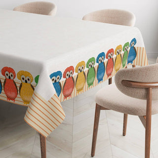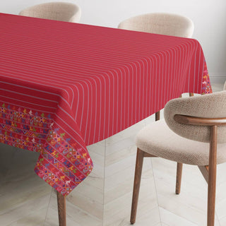 • Bold heritage, joyful spirit. Our Tiger Mask Tablecloth brings the energy of Guatemalan folklore to your table. Inspired by the iconic tiger mask, it features rows of blue and turquoise masks accented with hand drawn flowers. A bold yellow striped border completes the look with warmth and character.