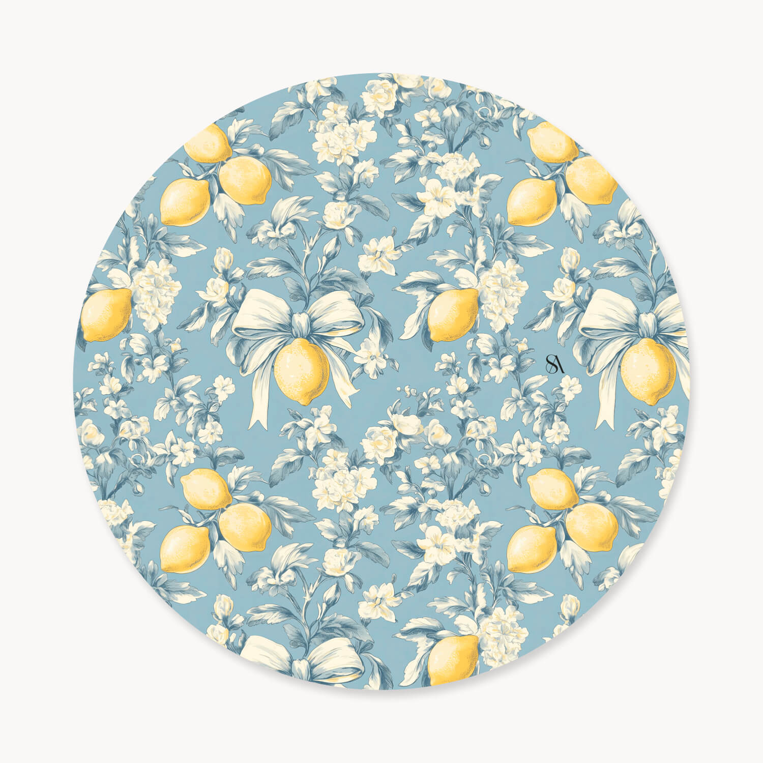 Bring a burst of French countryside charm to your table with our Charger Plate Cover Provence Citrus. This elegant design features golden lemons tied in soft ivory bows and surrounded by delicate florals in soft cream, all set against a dreamy powder blue backdrop. It’s fresh, romantic, and perfect for spring and summer gatherings.