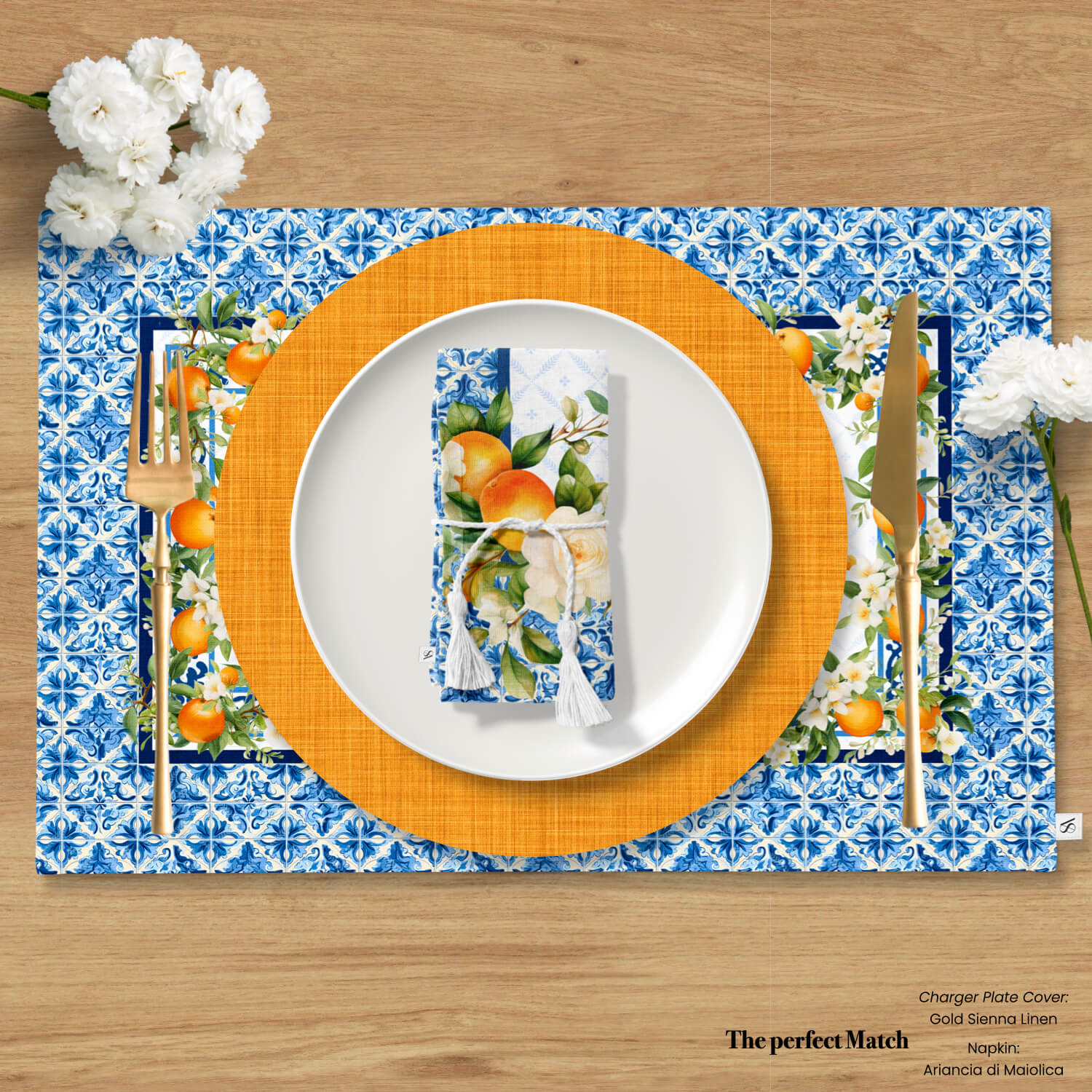 Bring the beauty of Italian tiles and citrus groves to your table with our Arancia di Maiolica Reversible Placemat. One side features vibrant oranges and white florals framing a soft blue patterned center, inspired by hand painted ceramics. The reverse reveals a bold cobalt and ivory tile motif for a classic Mediterranean look.