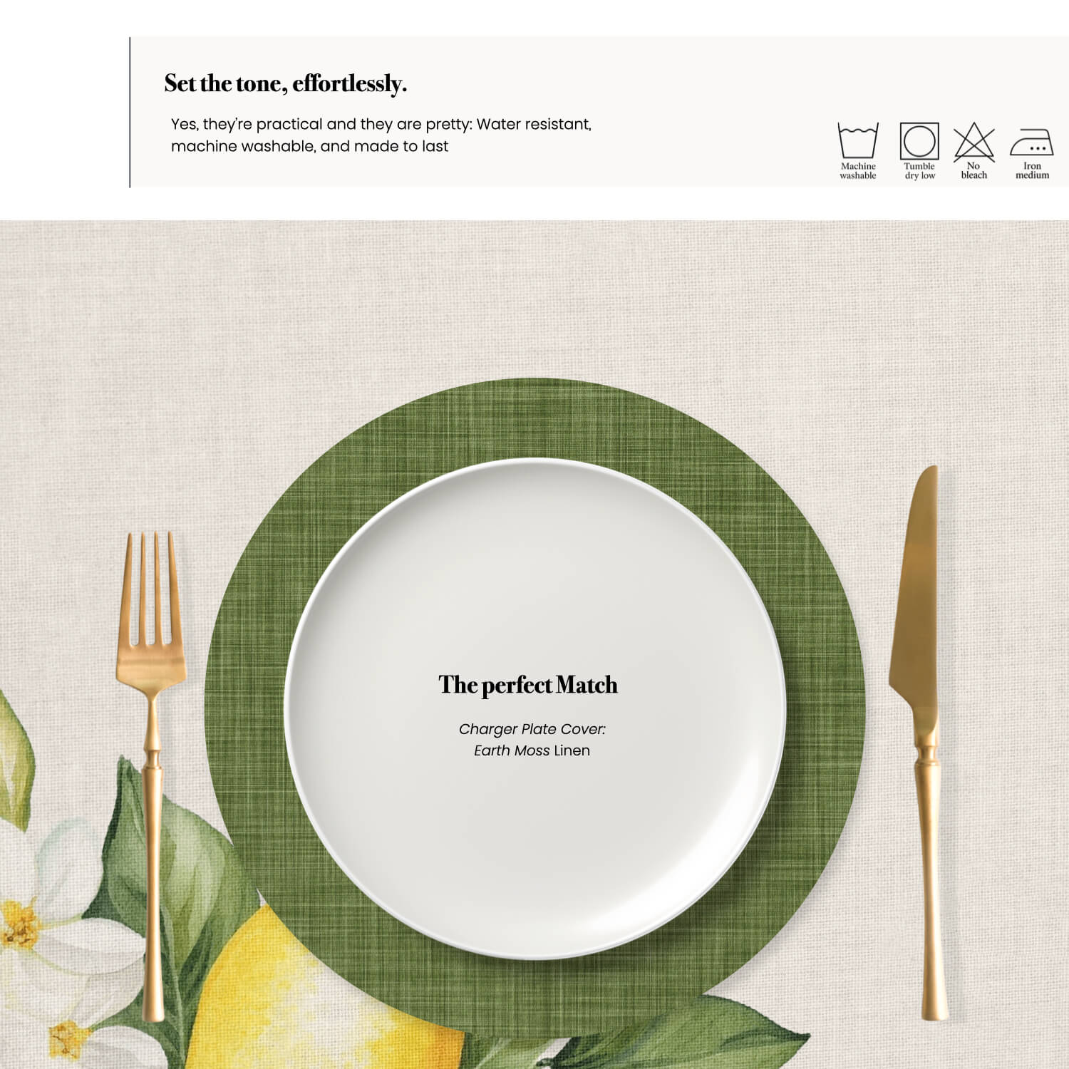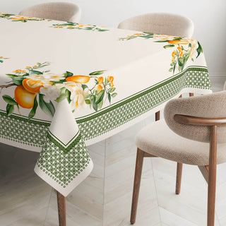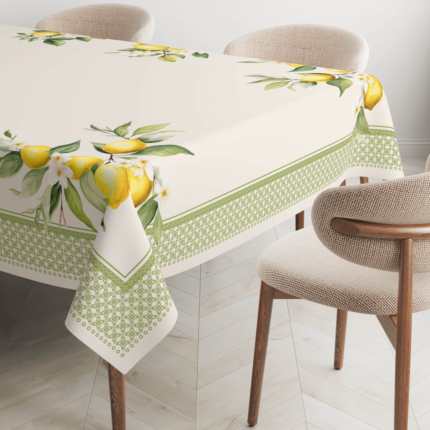 • Bring a splash of sunshine to your table with our Sorrento Lemon Tablecloth. This fresh, elegant design features watercolor lemons, lush green leaves, and delicate white blossoms set against a soft cream background. A crisp green woven look border adds balance and charm like a breeze from a Mediterranean orchard.