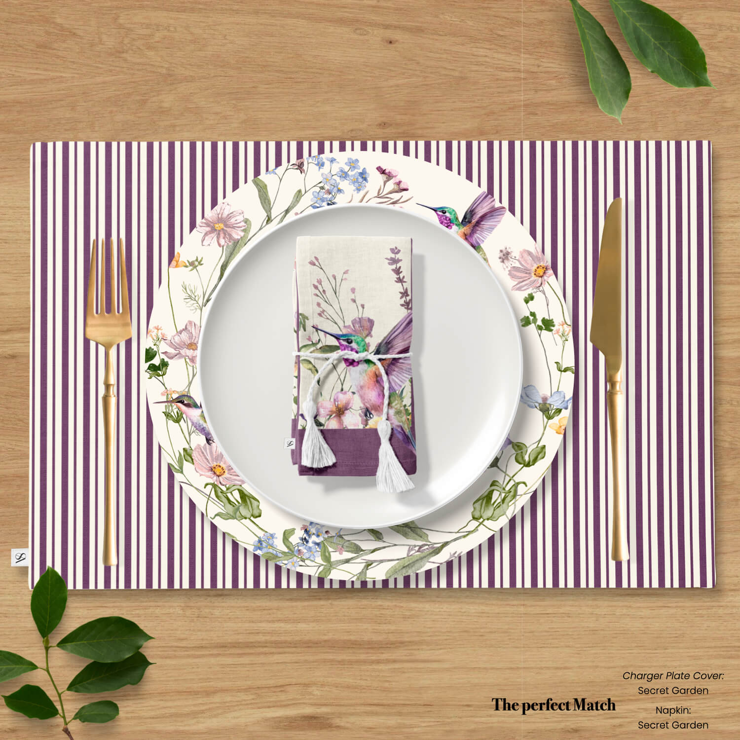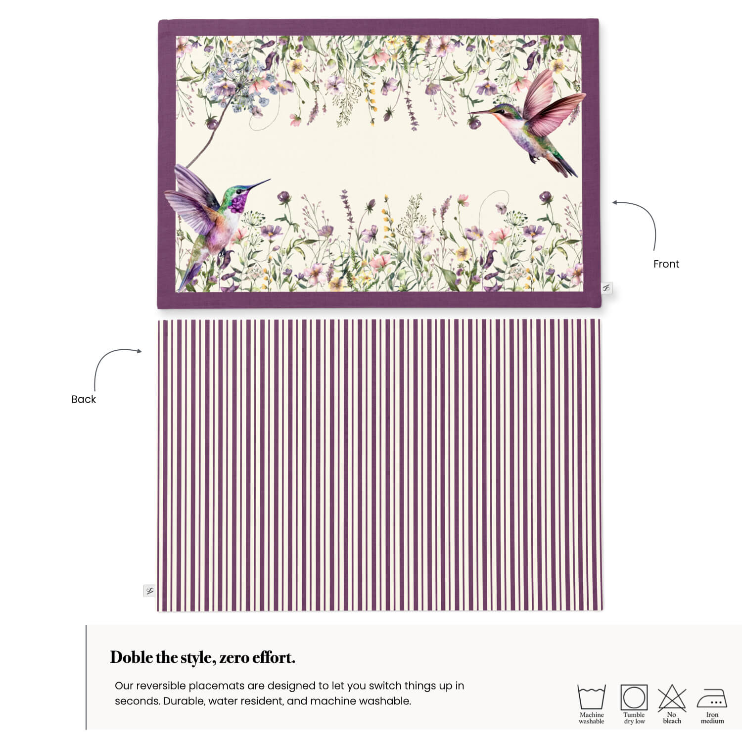 • Where magic meets the table. Our Secret Garden Reversible Placemat invites you into a dreamy scene of wildflowers and hummingbirds, framed by a rich berry toned border. Whimsical yet elegant, it’s perfect for moments that feel like little escapes. On the reverse, classic purple stripes bring a playful, timeless touch that pairs effortlessly with any setting.