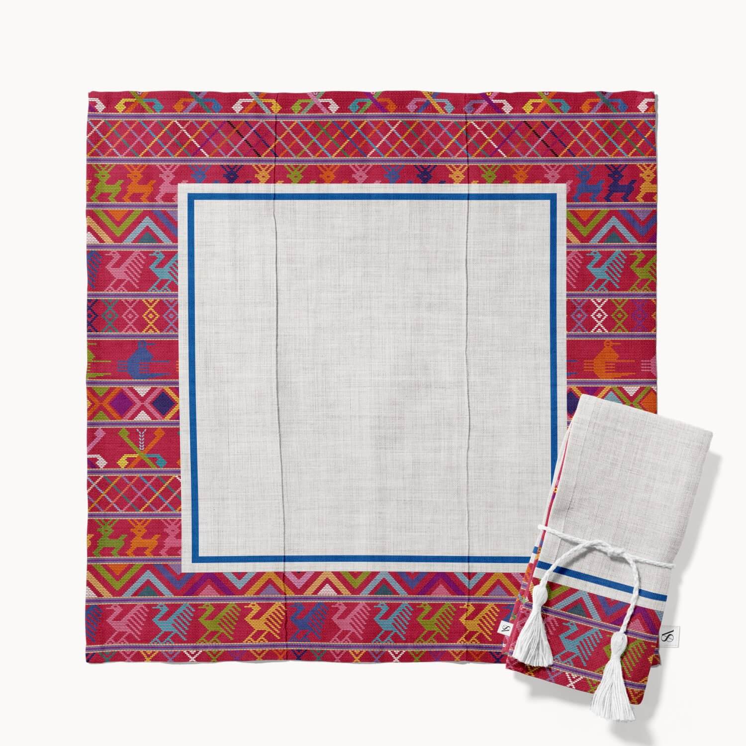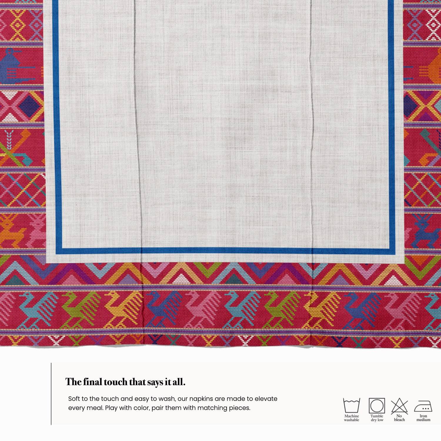 Celebrate vibrant heritage at your table with our Atitlán Napkin. Inspired by the joyful textile traditions of Lake Atitlán, it features a crisp white center framed by vivid reds, corals, and multicolored animal motifs a tribute to Guatemala’s iconic weaving artistry.
