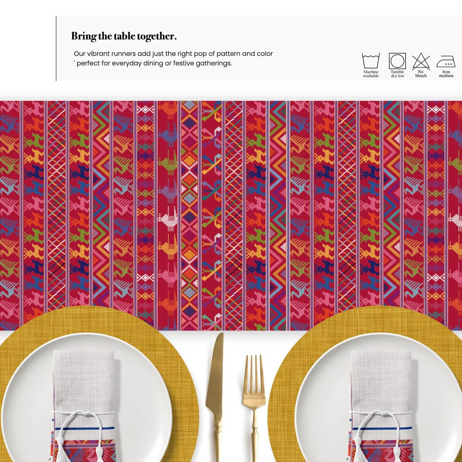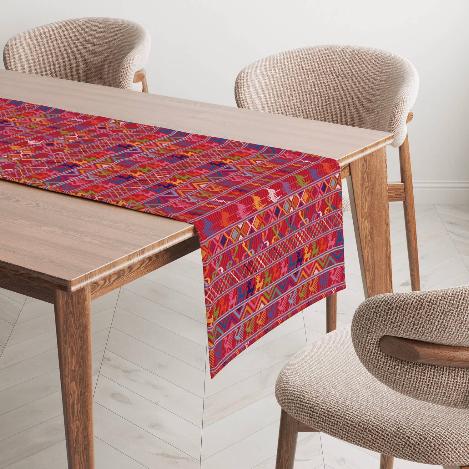 • Where bold heritage meets everyday beauty. Our Atitlán Table Runner celebrates the colorful huipiles of Lake Atitlán with joyful energy. Rows of geometric motifs, animal figures, and bold zigzags in bright reds, yellows, greens, and blues make it a true statement of culture and color at your table.