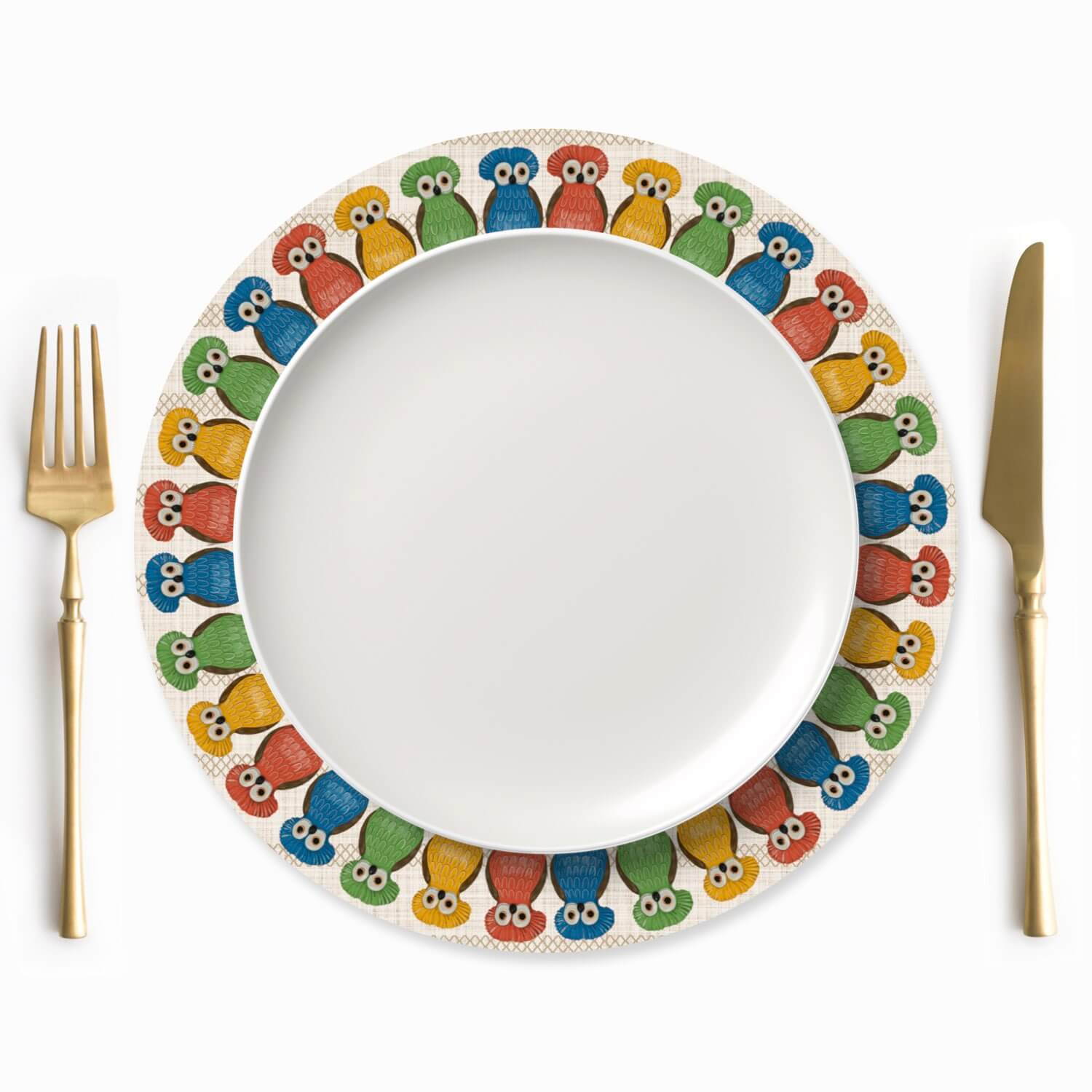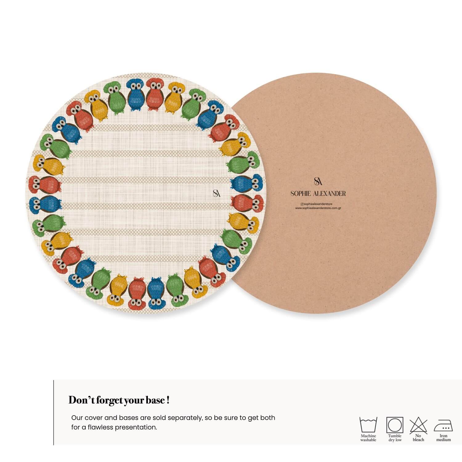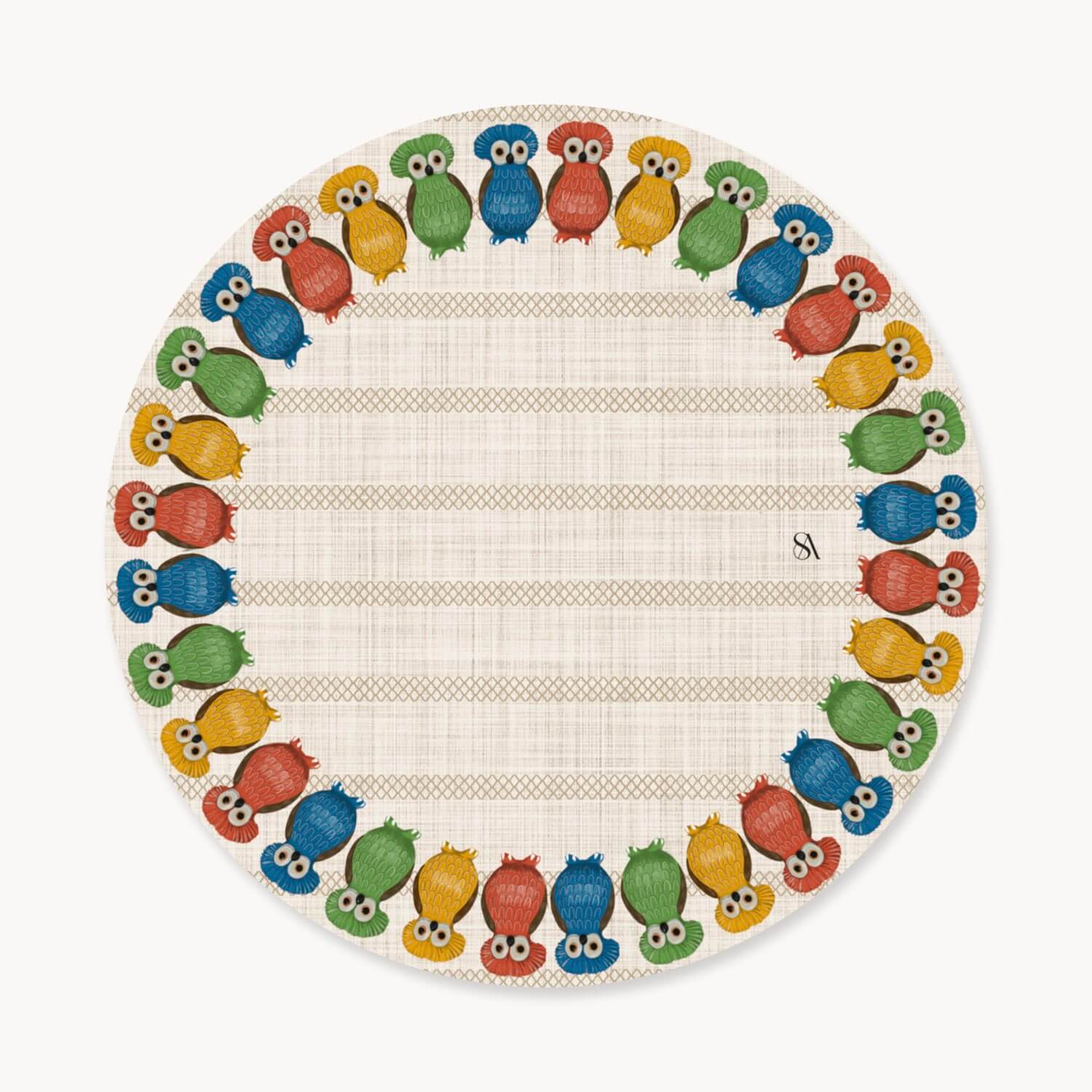 Colorful, joyful, and full of personality our Owl Charger Plate Cover adds a playful spirit to any tablescape. Featuring an adorable parade of owl; in rich tones of blue, green, red, mustard, and orange, this design is inspired by Guatemala’s love for storytelling through textiles and symbolism.
