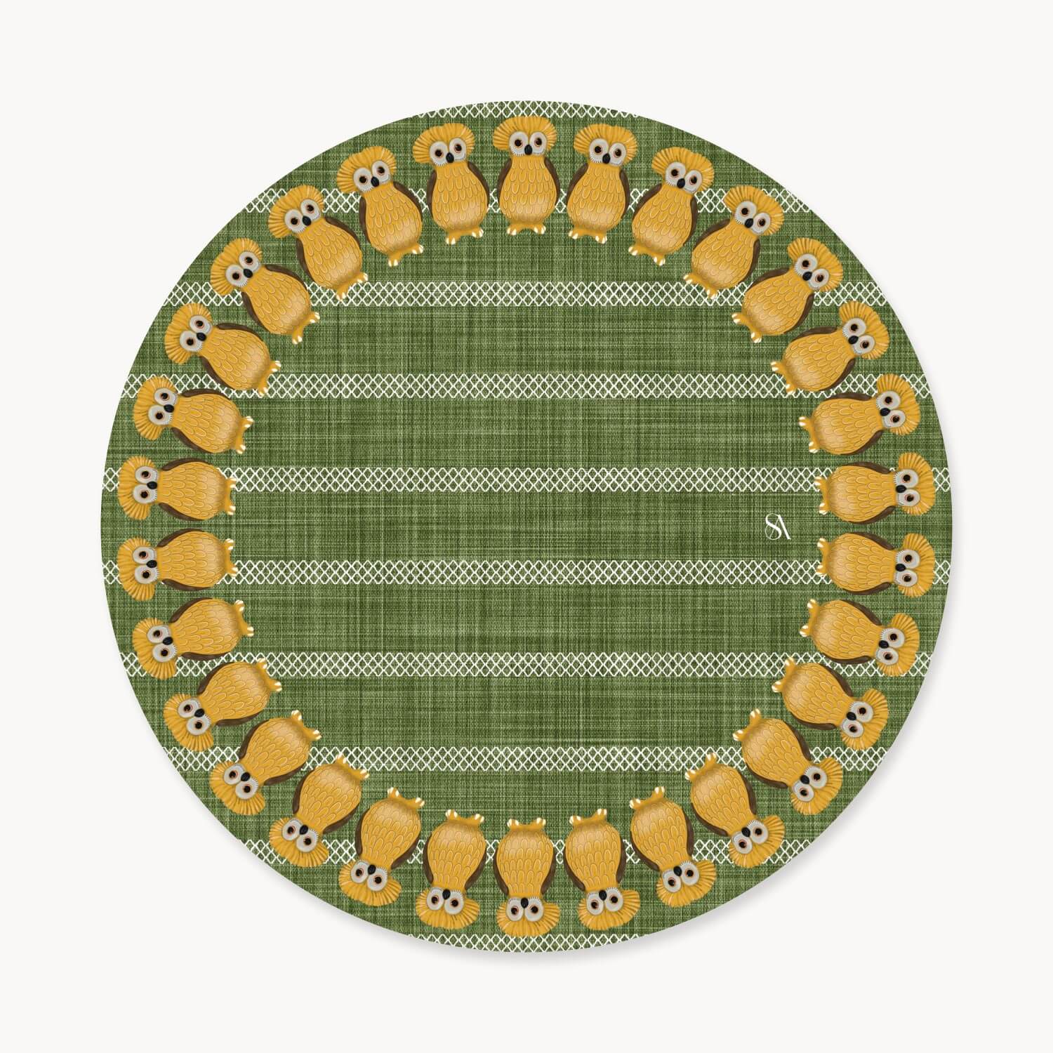 Warm, earthy, and filled with personality, the Mustard Owl Earth Moss Linen Charger Plate Cover is a celebration of playful tradition. With its olive toned linen look background and a full ring of sunny yellow tecolotes (owls), this piece brings a charming touch of Guatemala’s spirit to your table perfect for fall gatherings, cozy dinners, or everyday warmth.