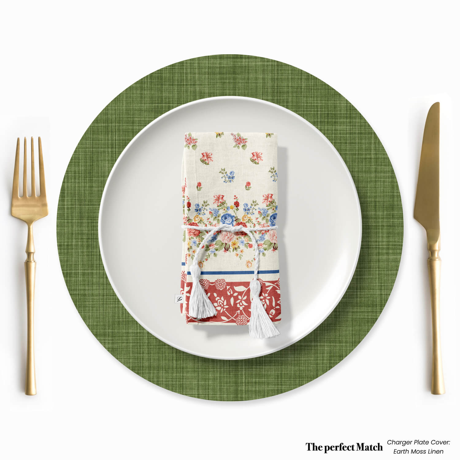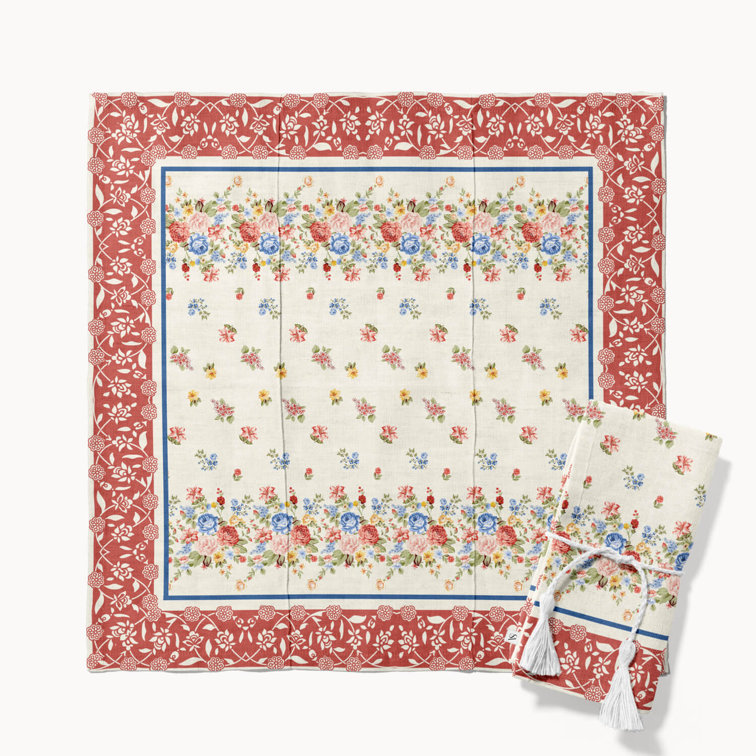 Countryside charm. Our Country Blossom Napkin features a romantic floral band in blue, coral, and yellow over a soft ivory backdrop. A red lace inspired border adds vintage character and warmth. Handmade from easy care fabric, it’s a cheerful accent for cozy breakfasts or festive family gatherings.