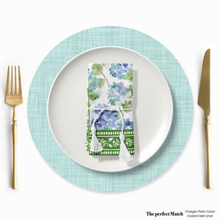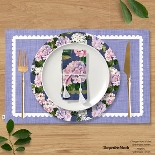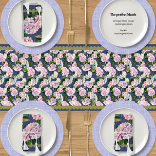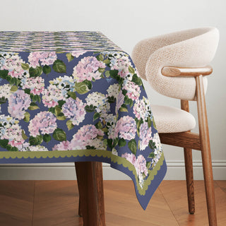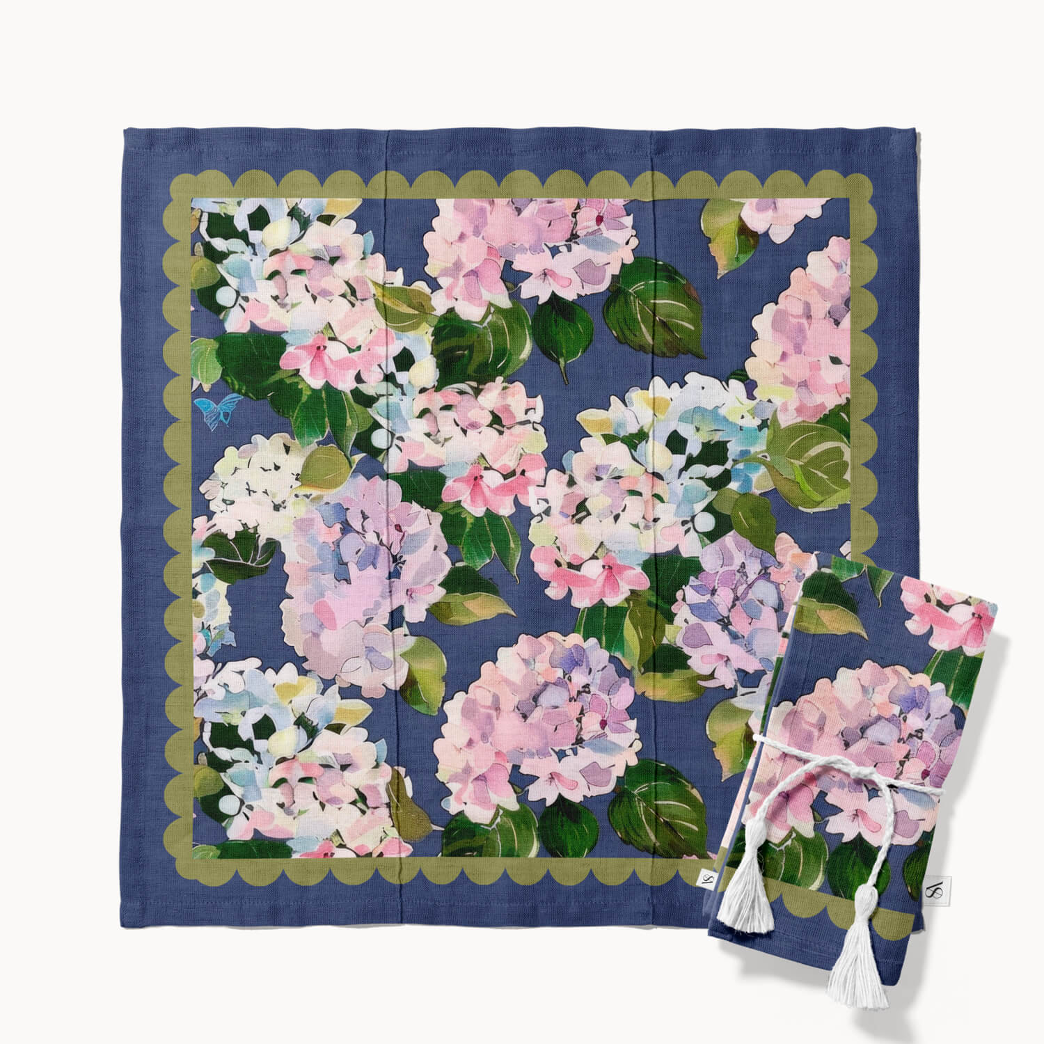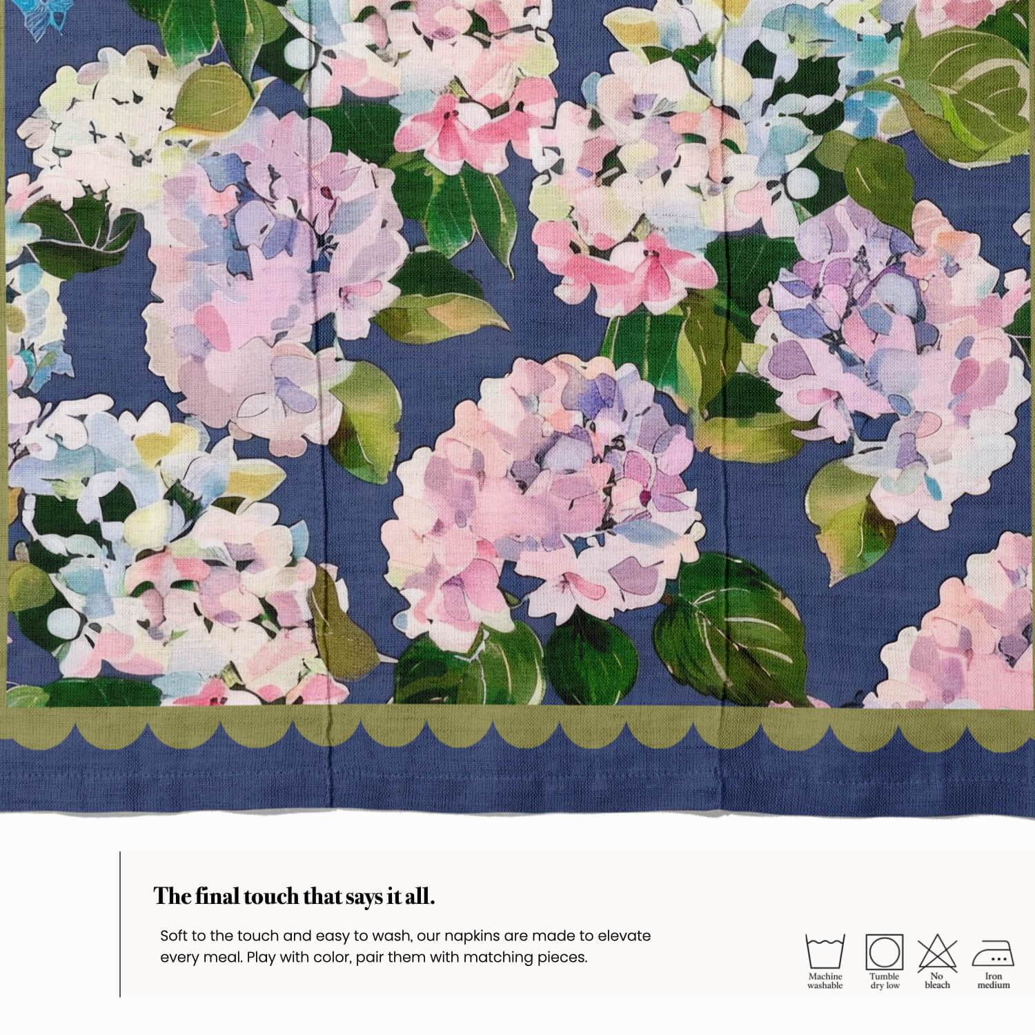Bursting with painterly charm, our Hydrangea Haven Napkin brings timeless floral beauty to your table. Full hydrangea blooms in soft pinks, lilacs, and ivory unfold over a rich navy backdrop, framed by an olive green scalloped border. Vibrant yet classic, it’s a design that elevates both everyday meals and special gatherings.