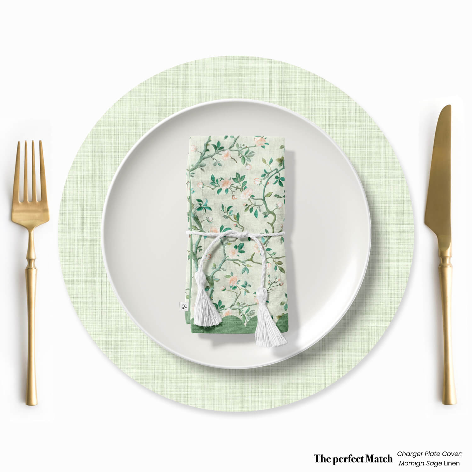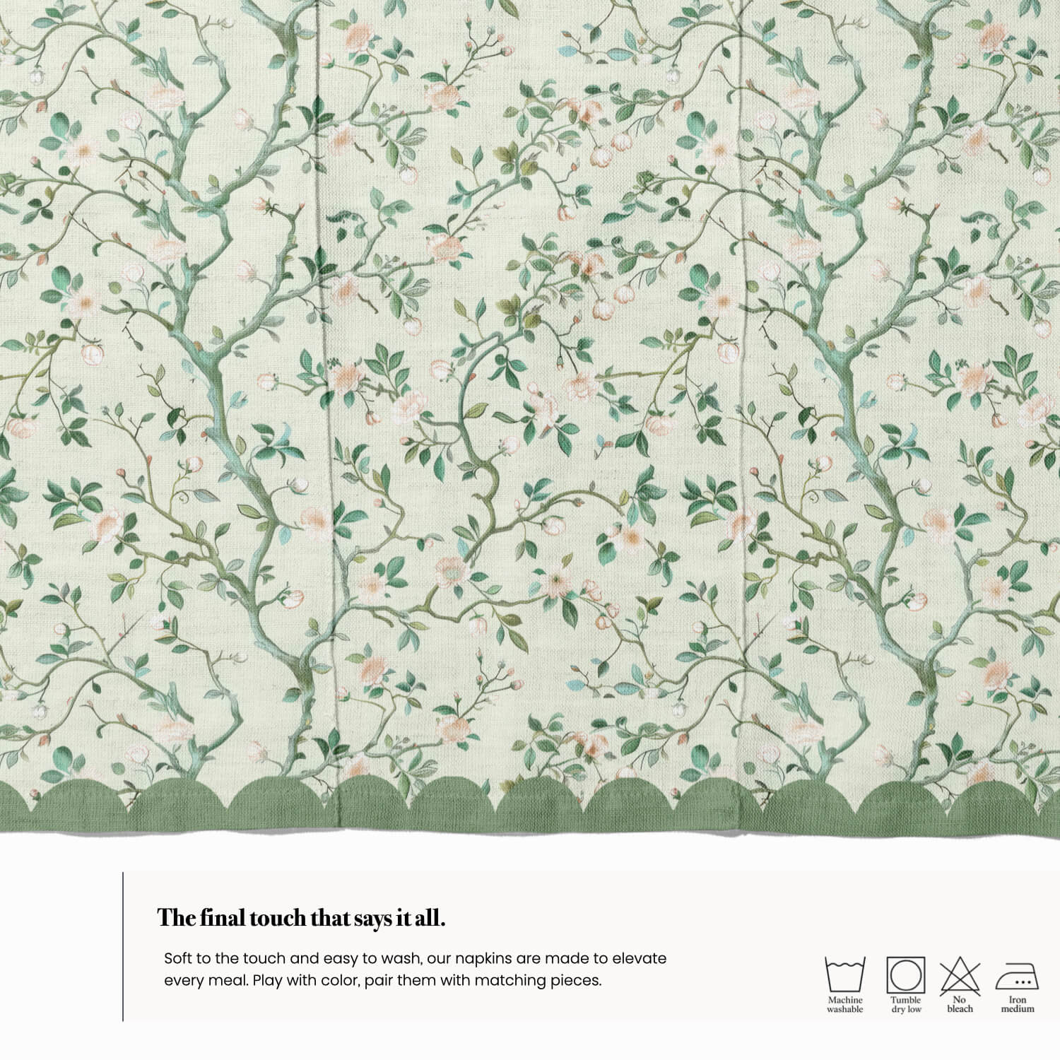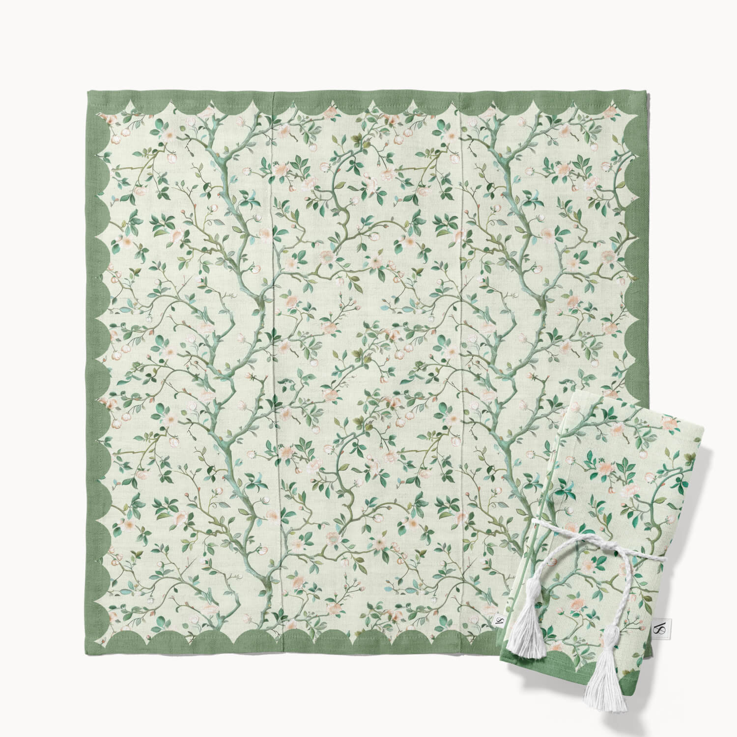 Set a serene and elegant tone with our Whispers of Spring Napkin. Intertwining branches with tiny blush blossoms bloom across a soft sage green backdrop. A scalloped border frames the design with grace, evoking the quiet beauty of nature awakening after winter delicate, timeless, and perfect for elevating any table setting.
