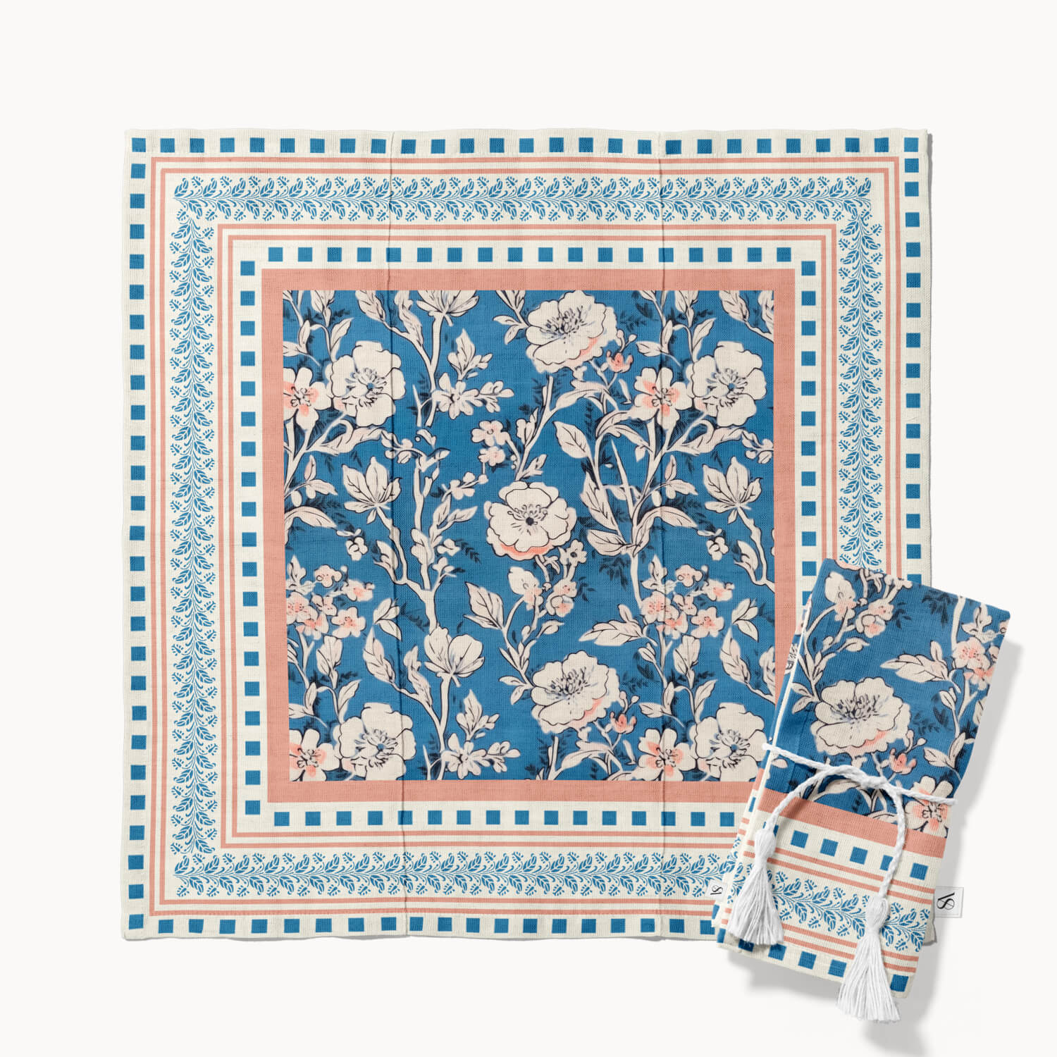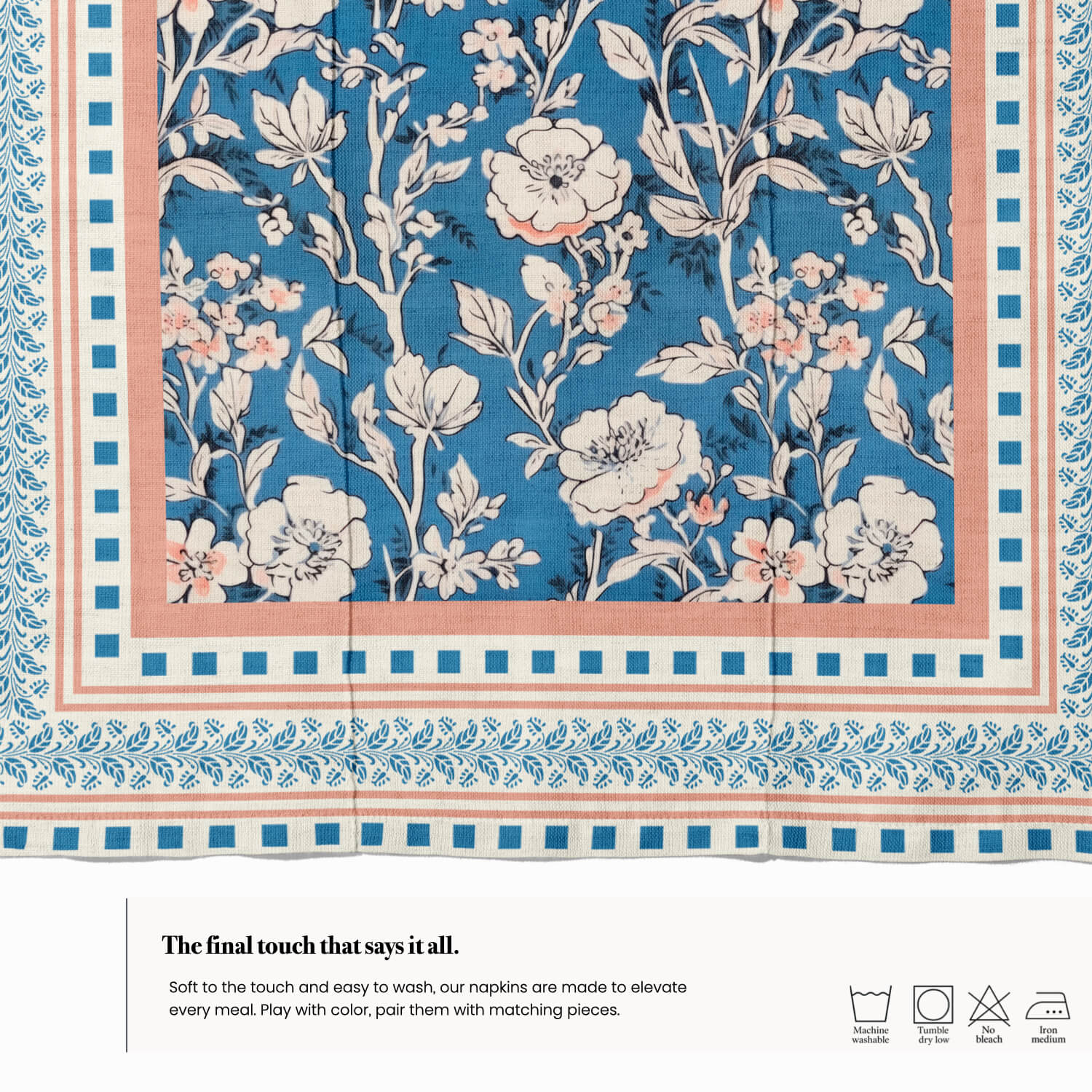 • Bold elegance. Our Wild Indigo Napkin showcases hand painted florals in blush and ivory, dancing across a deep indigo backdrop. A blush border with blue check trim adds a refined finish. Handmade from easy care fabric, it’s perfect for blending vintage flair with modern beauty at your table.