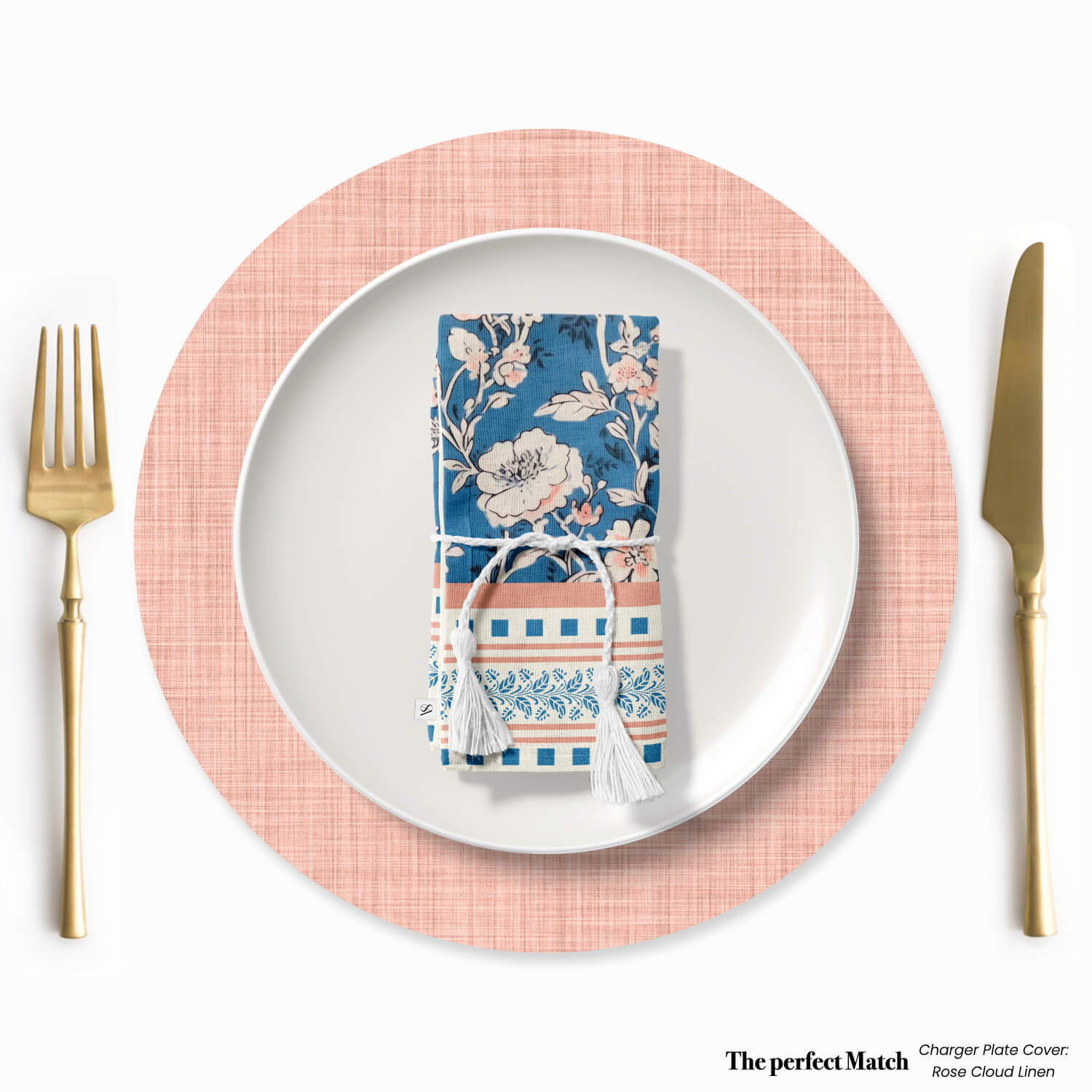Bold elegance. Our Wild Indigo Napkin showcases hand painted florals in blush and ivory, dancing across a deep indigo backdrop. A blush border with blue check trim adds a refined finish. Handmade from easy care fabric, it’s perfect for blending vintage flair with modern beauty at your table.