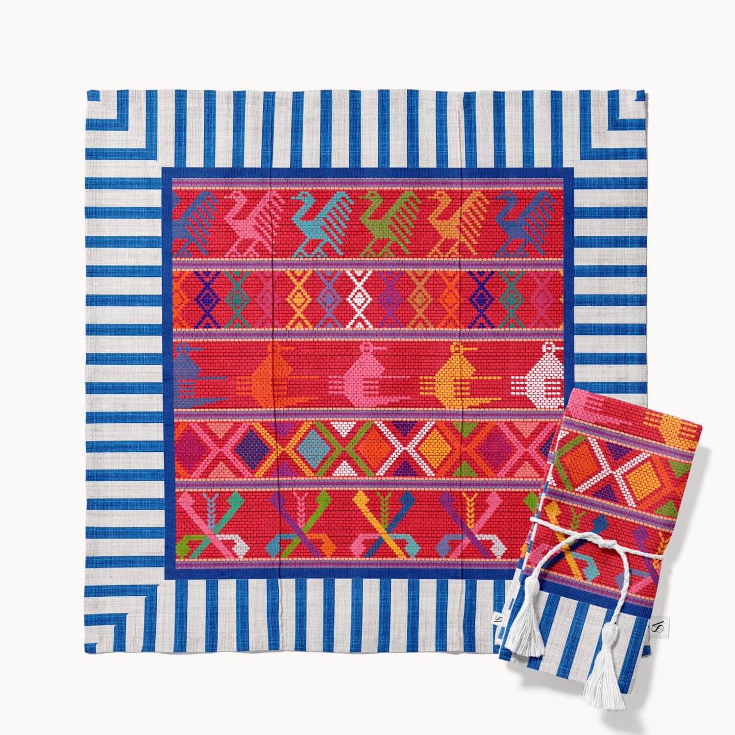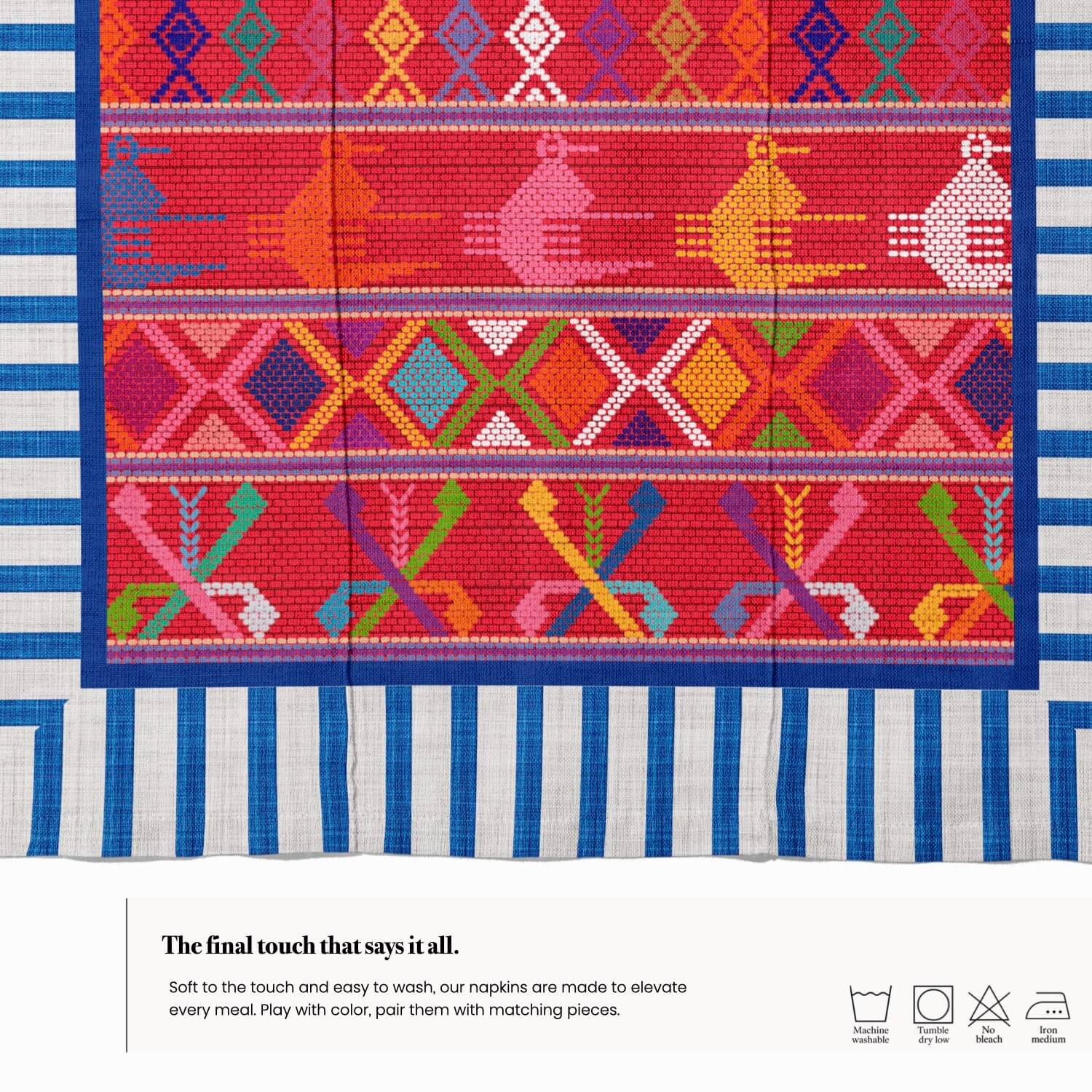 Add a coastal twist to Guatemalan tradition with our Atitlán Indigo Bay Napkin. Showcasing bold motifs from the Lake Atitlán region birds, animals, and geometric designs it’s framed by a crisp blue and white striped border that lends a fresh, nautical touch to your table.