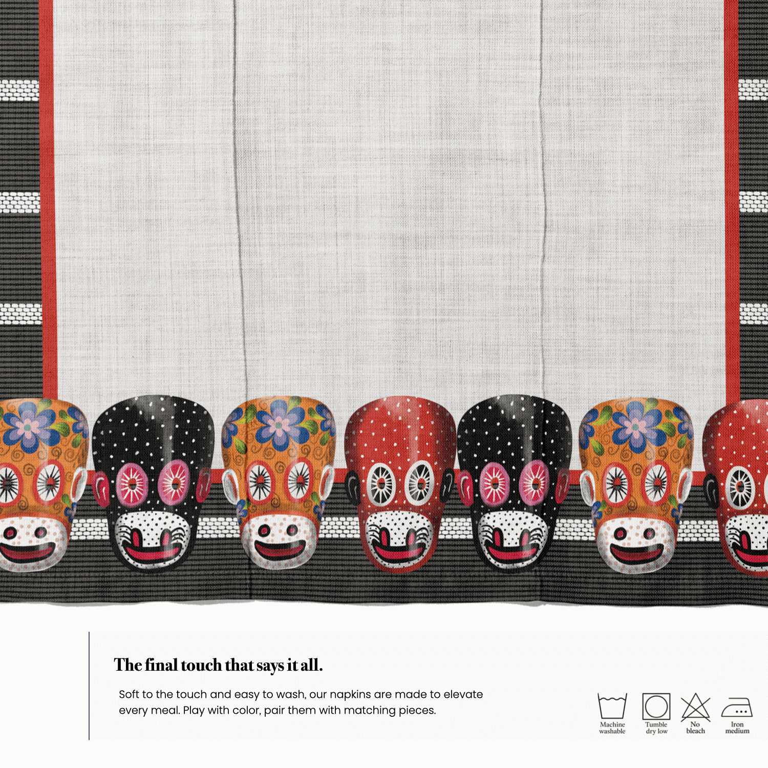 • Make a bold statement with our Black Monkey Mask Napkin, part of the Guatemala Collection. Featuring Guatemala’s iconic monkey mask, this design blends tradition and joy in every detail. A rich black textile inspired background contrasts with colorful, hand painted characters each one telling a story of folklore and celebration.