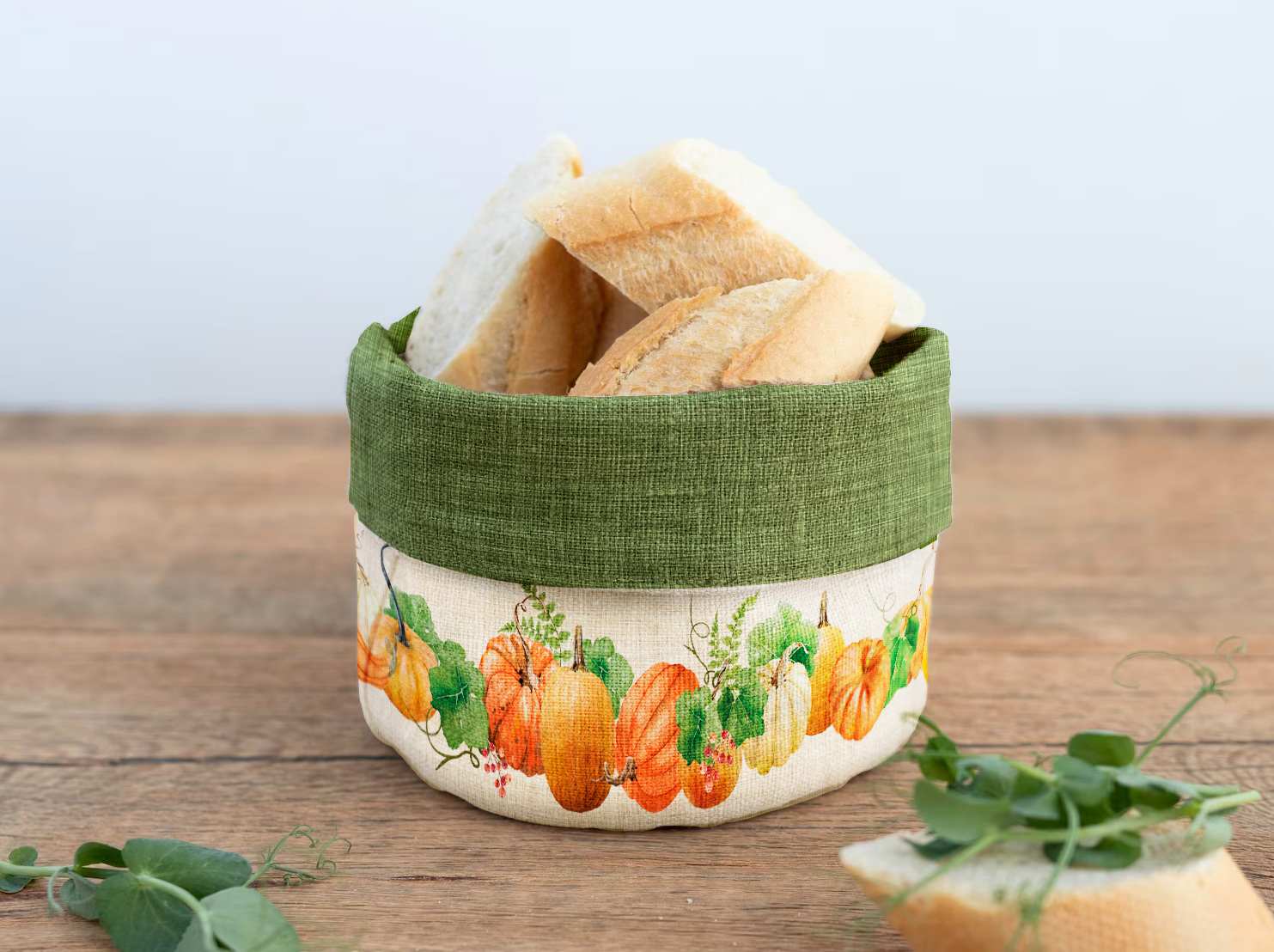 Celebra la temporada con nuestra Panera Pumpkin Harvest. Con un diseño de calabazas en tonos cálidos sobre un fondo neutro y un borde verde musgo de textura lino, esta pieza artesanal es práctica y encantadora. Perfecta para servir pan, repostería o frutas, añade un toque festivo y acogedor a tu mesa.
