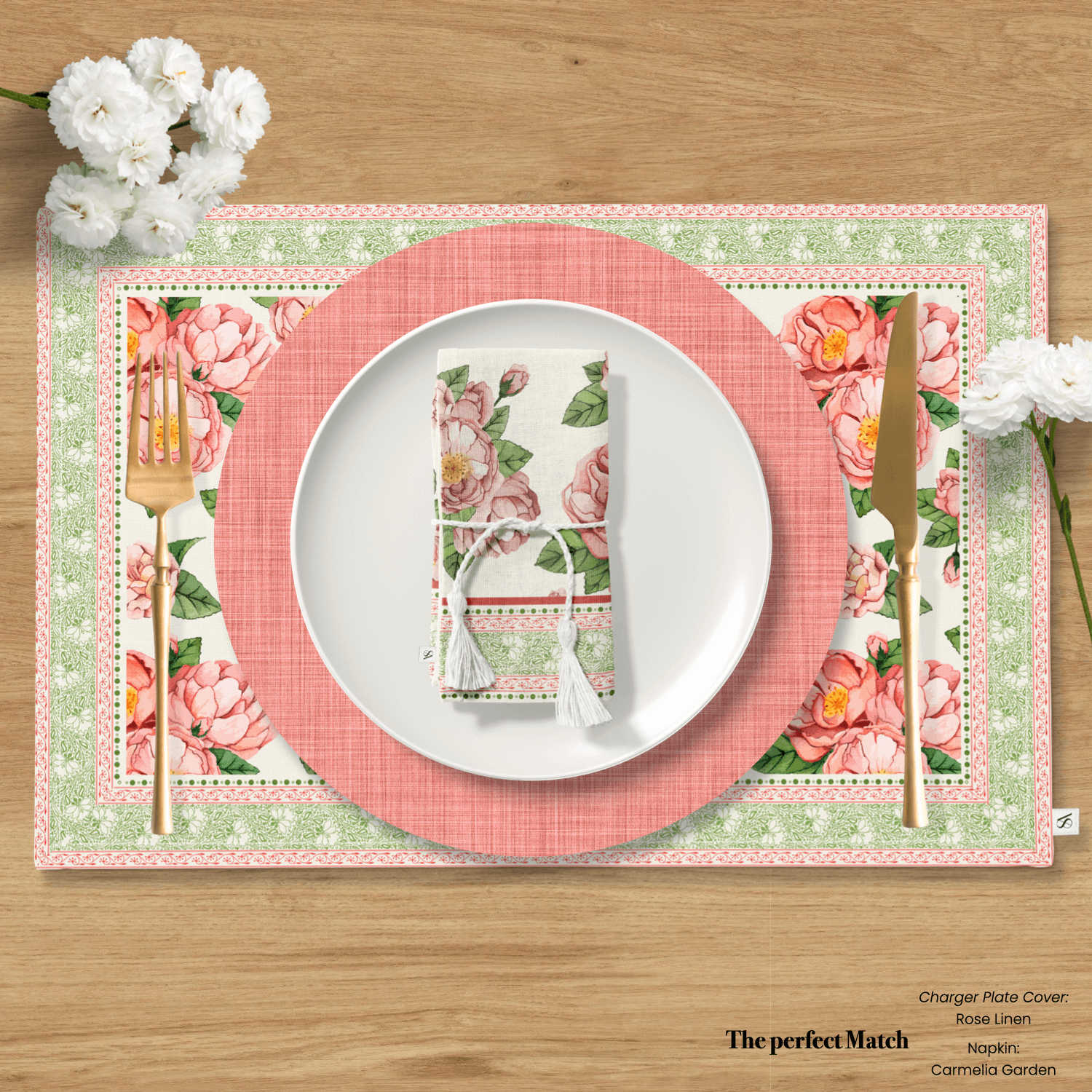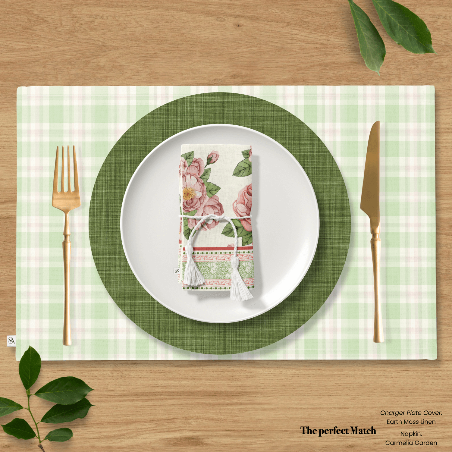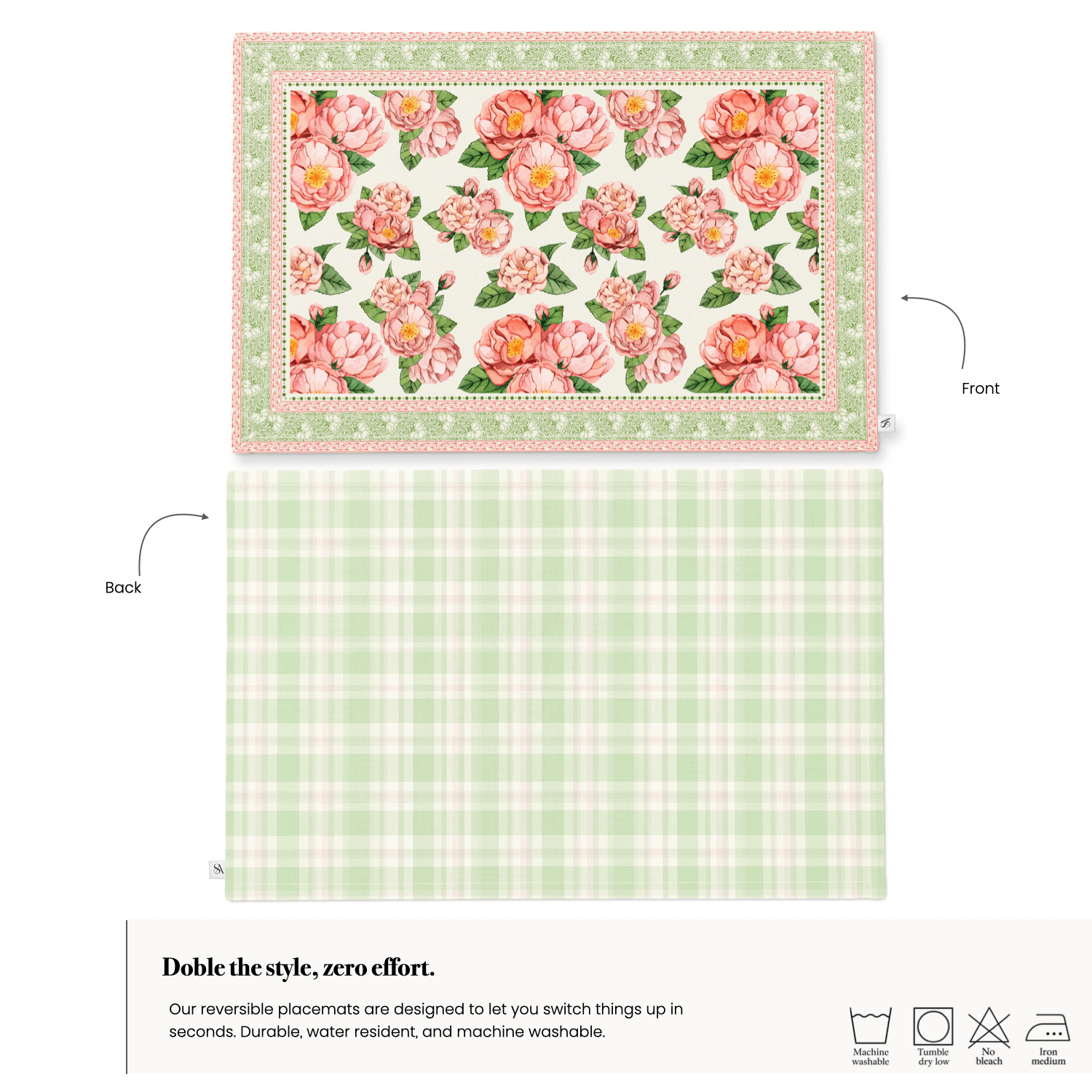 Bring effortless charm to your table with our Carmelia Garden Reversible Placemat. One side blooms with pink peonies framed by delicate floral borders in soft green and rose. Flip it over to reveal a fresh green plaid perfect for casual outdoor dining or adding everyday elegance with a versatile twist.