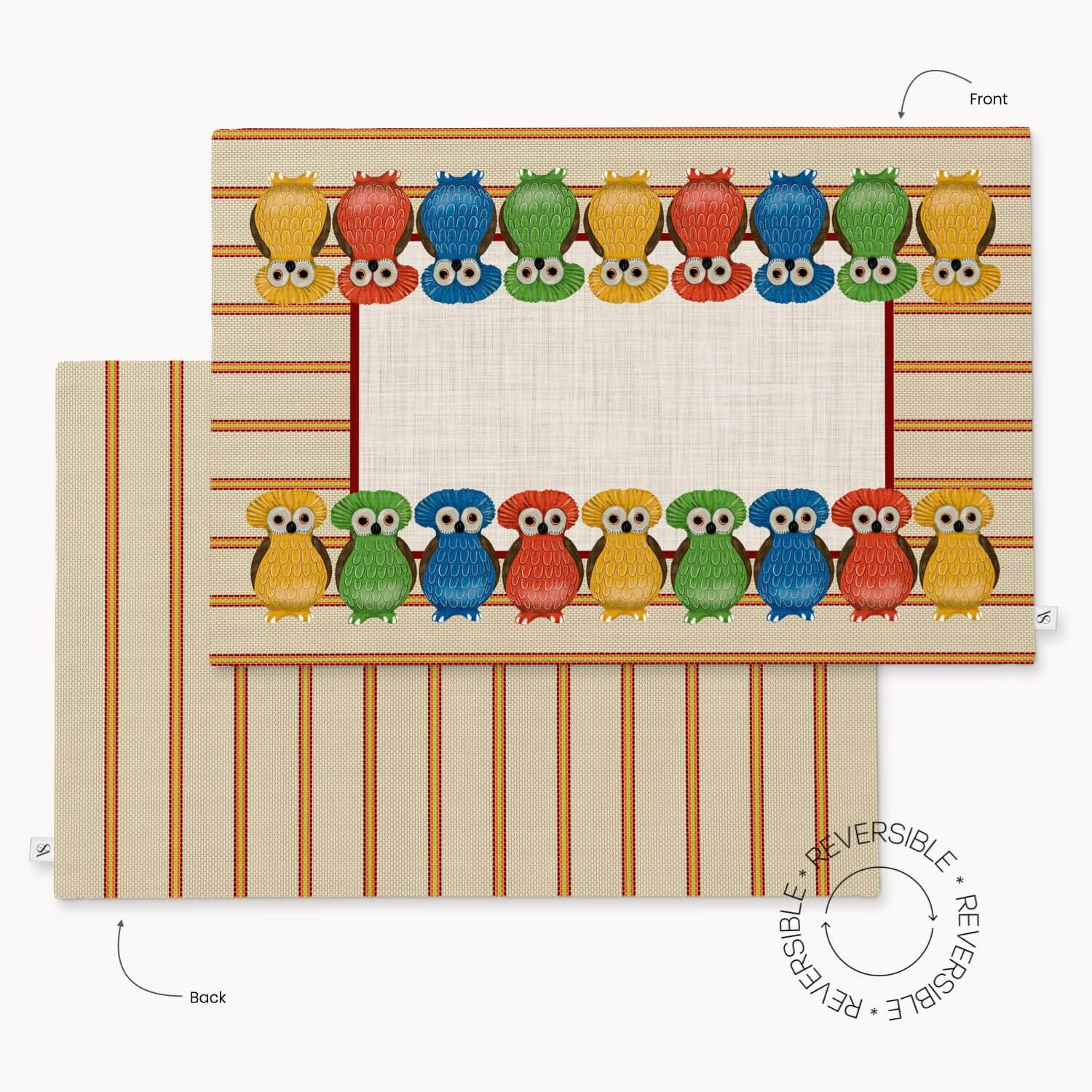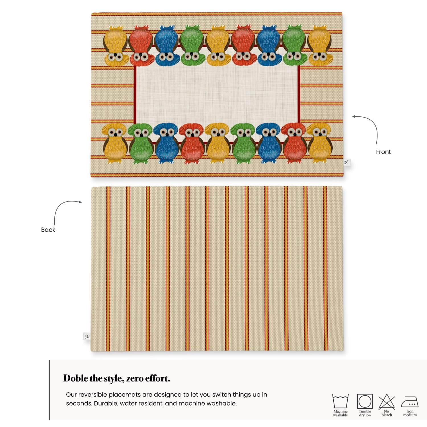 Add a warm touch to your table with our Owl Sand Reversible Placemat. Inspired by Guatemalan huipiles, it features a versatile double sided design: one side with a soft sand backdrop and intricate stripes, the other with vibrant owls perched around a white center like cheerful guests at the table.