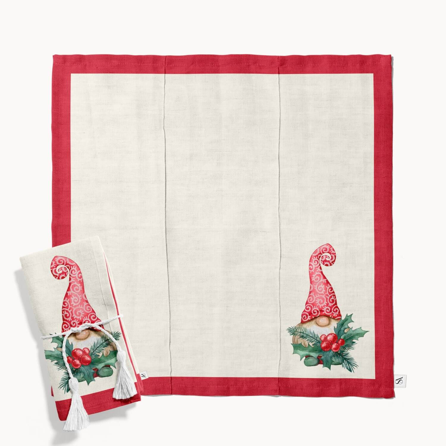 Encantadora y alegre, esta servilleta presenta un simpático gnomo navideño en tonos rojos con detalles verdes y bayas invernales. Su diseño aporta un toque de magia y diversión a la mesa, perfecto para celebraciones familiares llenas de espíritu festivo.