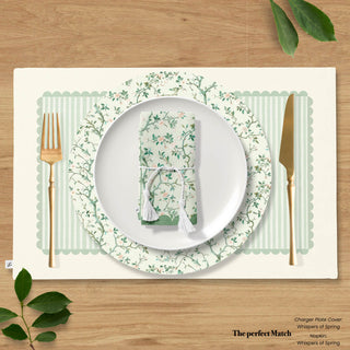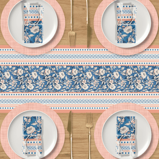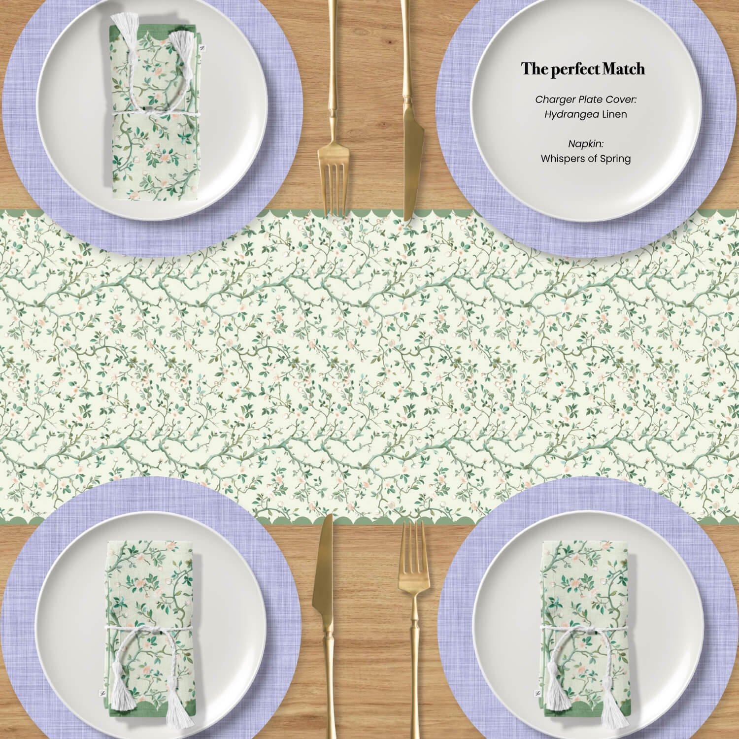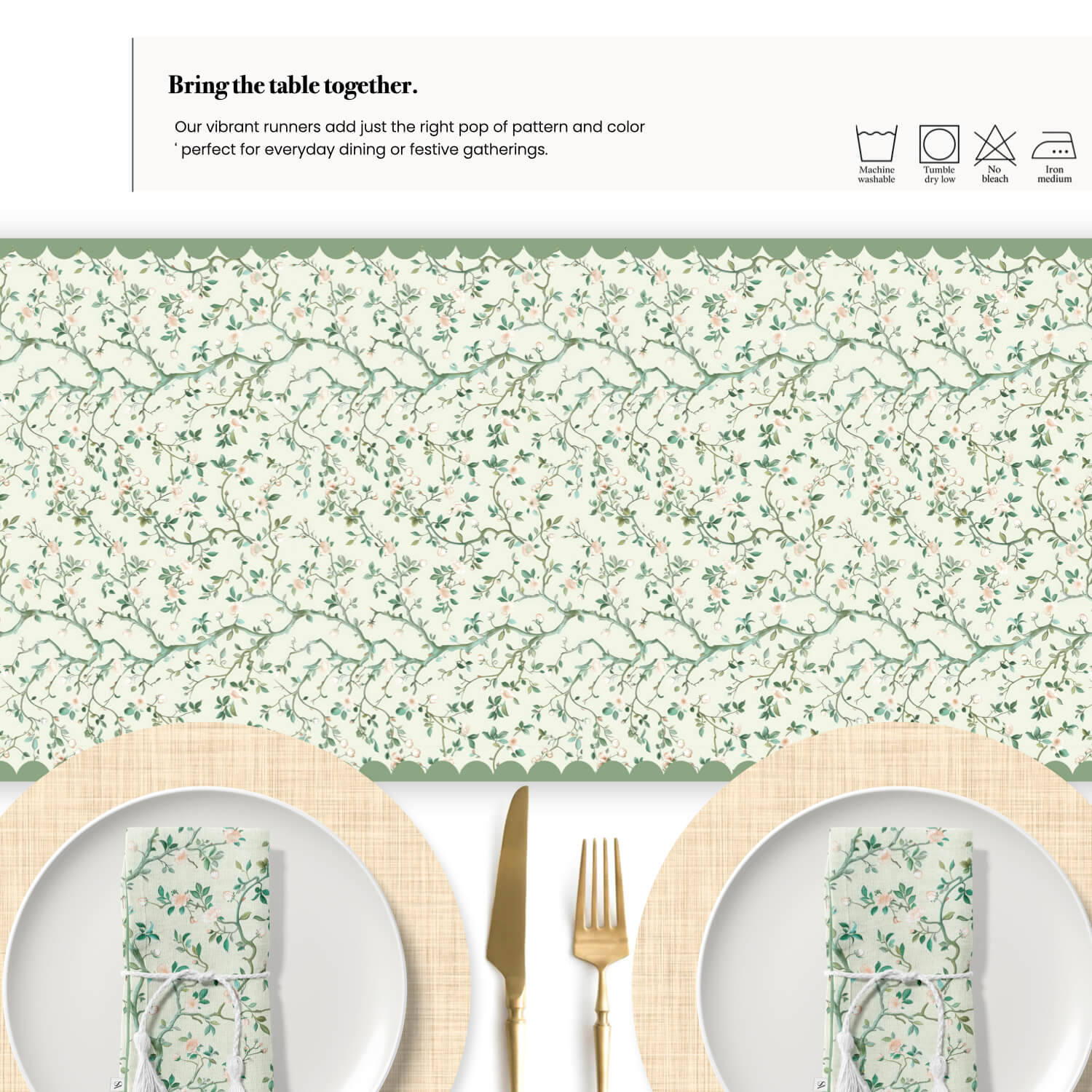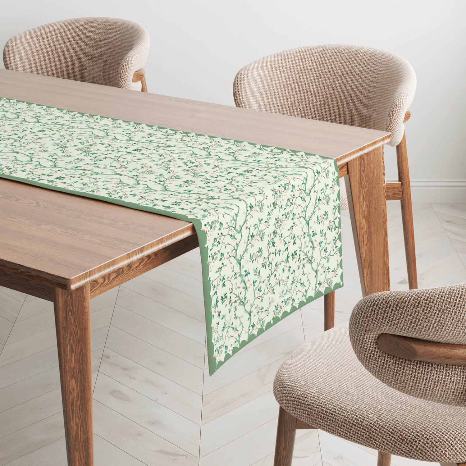 Brighten your meals with our Whispers of Spring Table Runner. Delicate branches with tiny blush and coral blossoms wind gracefully across a soft cream background, framed by a fresh sage green border that adds balance and calm to every setting.