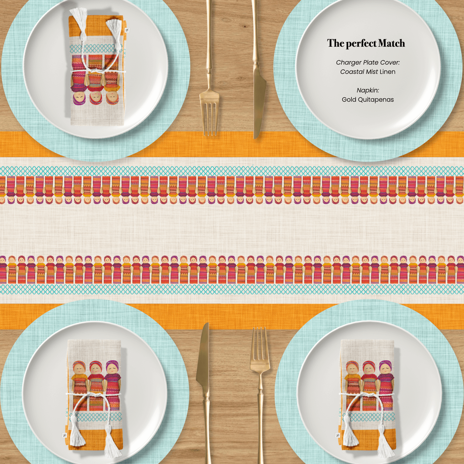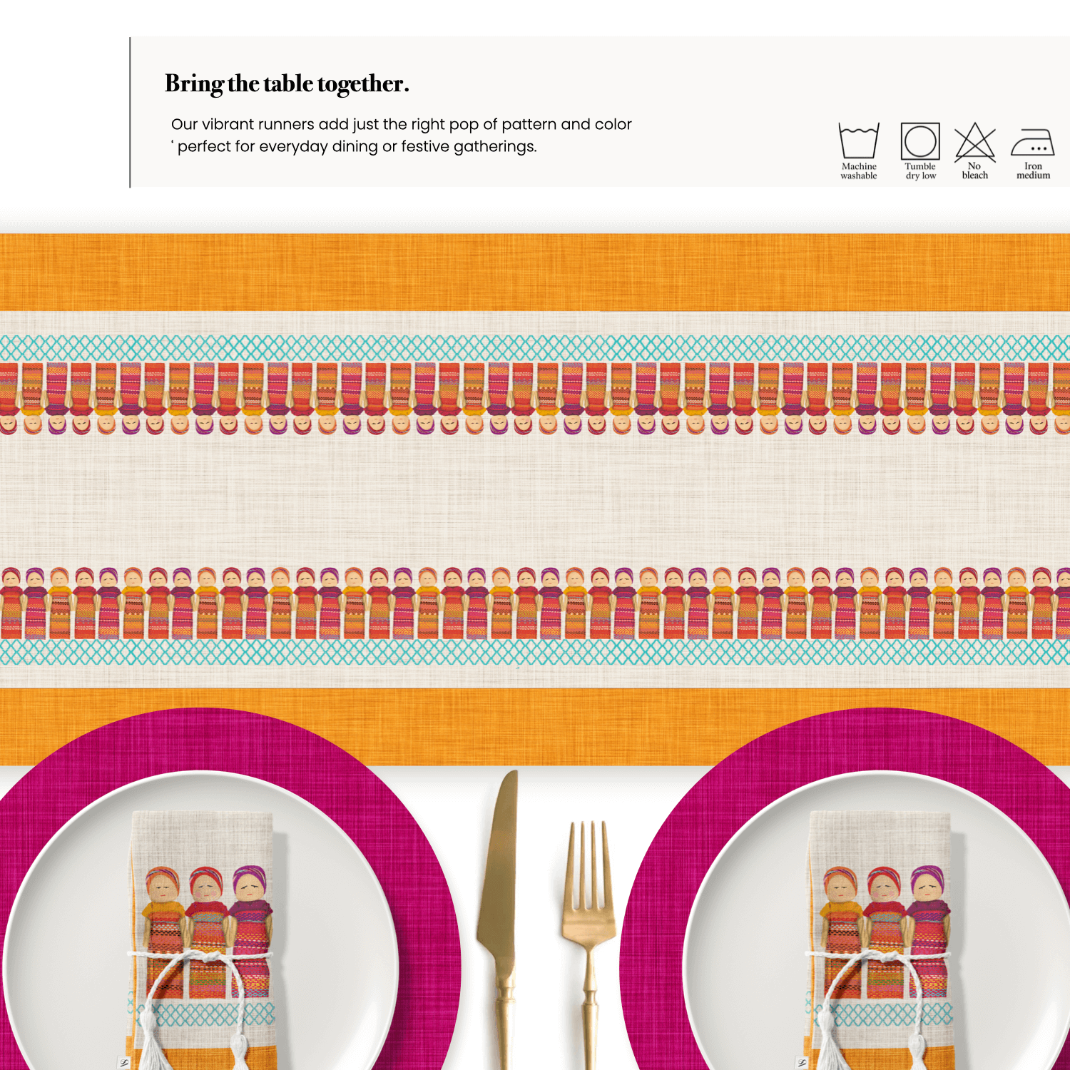 Our Gold Sienna Worry Doll Linen Table Runner adds sunshine and folklore to your table. Rows of colorful worry dolls line a cream center, framed by a bold golden orange border with turquoise details that echo Guatemalan markets. Durable and linen like, it’s practical yet full of heart perfect for joyful gatherings or everyday meals.